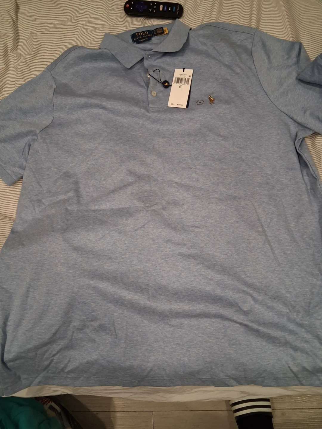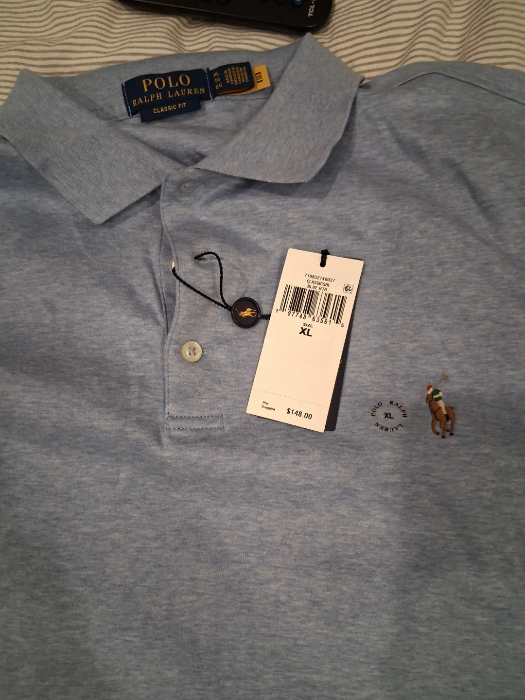 This is a light blue Polo Ralph Lauren classic fit polo shirt. It's size XL and features the iconic polo player logo. Original price was $148.00. + tax brand new with tag selling 75$