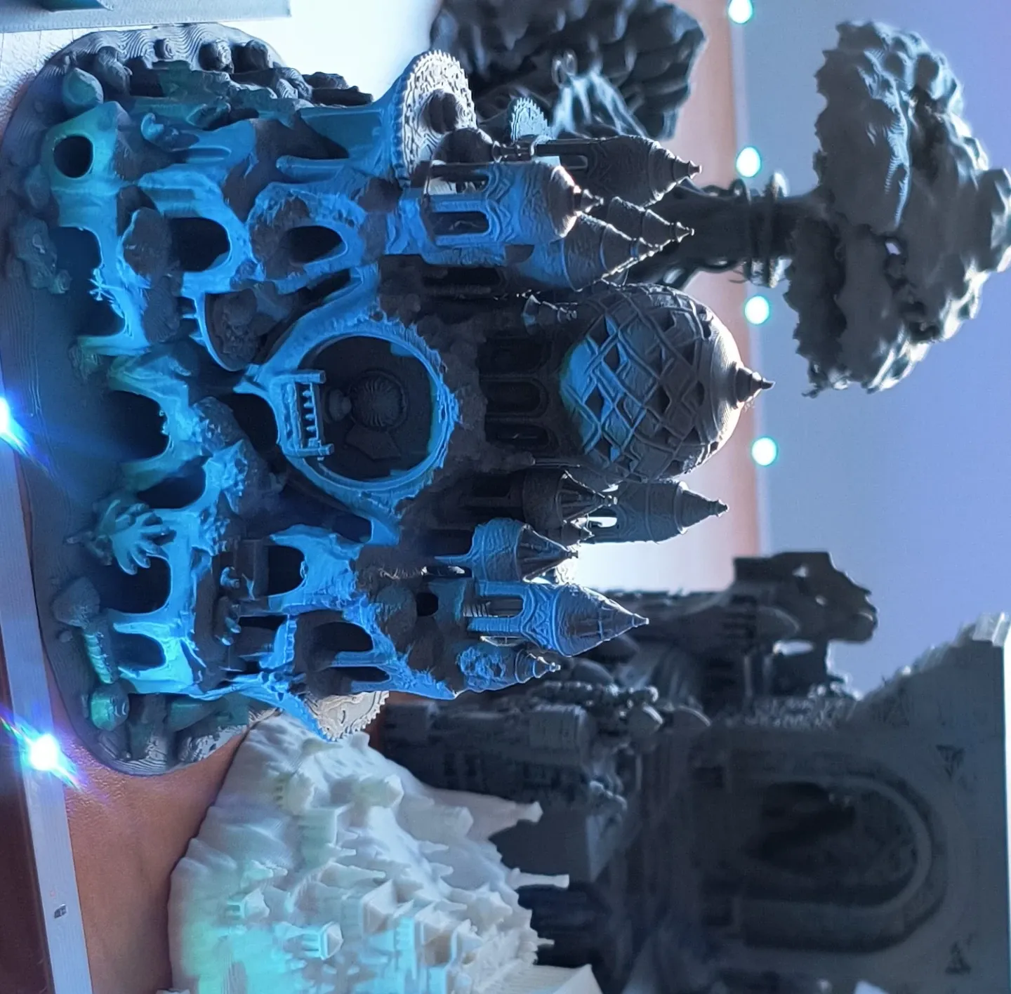 Detailed 3D printed fantasy castle diorama. Intricate design with multiple towers and structures. Great for display or as a gaming terrain piece!