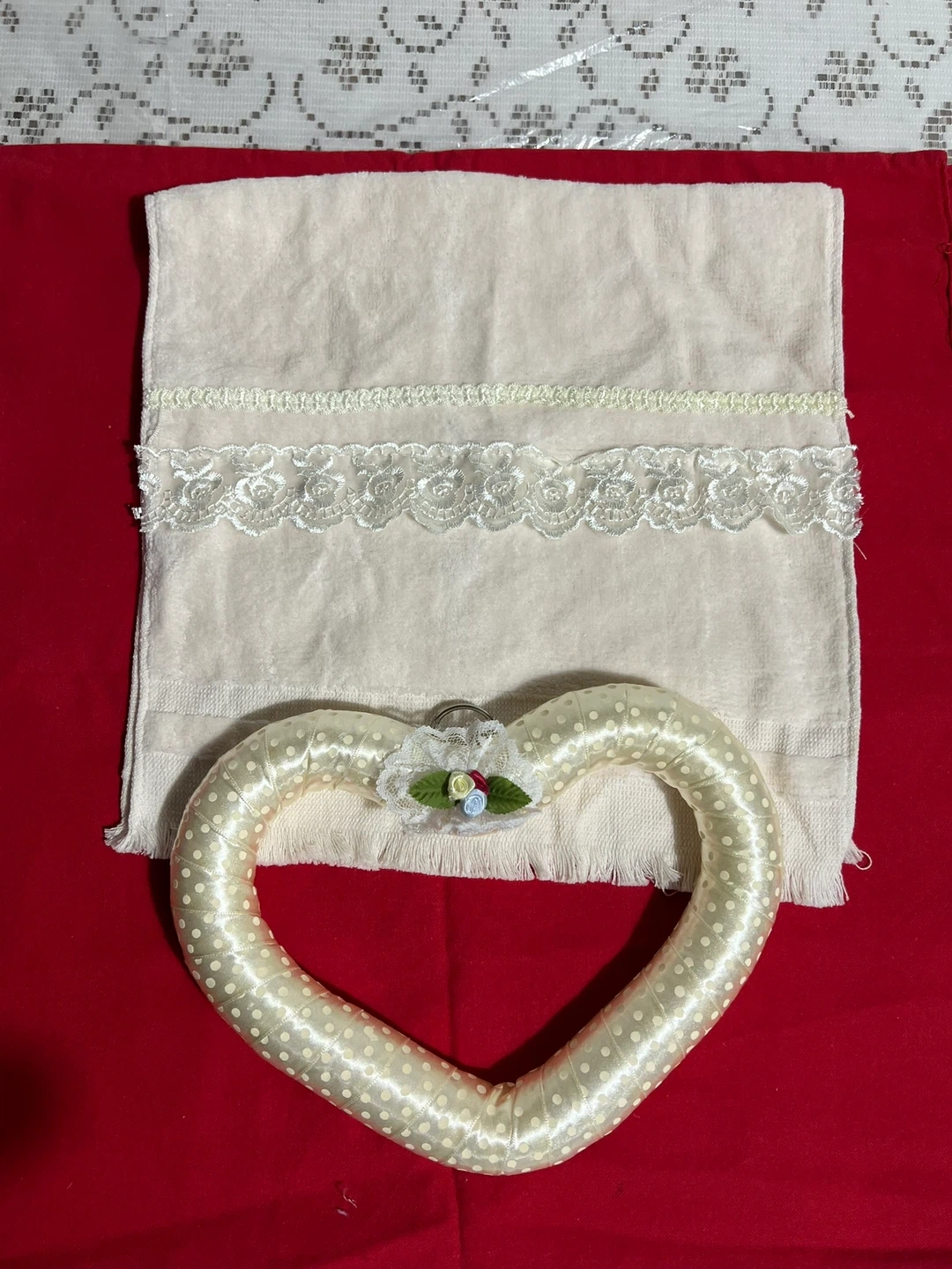 A lovely decorative towel with delicate lace trim, paired with a charming heart-shaped decoration. Perfect for adding a touch of warmth to your home decor