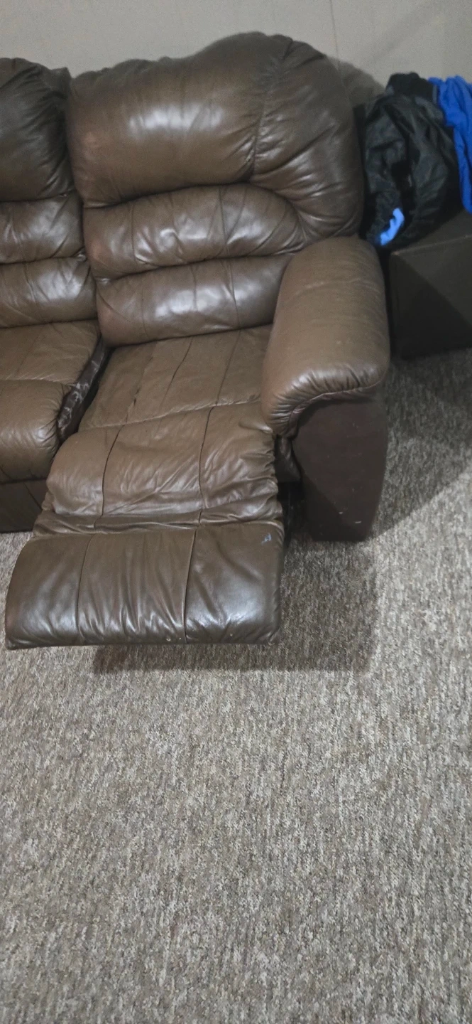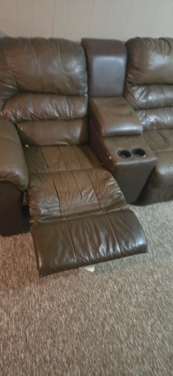 This brown leather loveseat recliner features two reclining seats and a centre console with cup holders. The recliner seats offer comfortable seating options. It's a great addition for any living room or entertainment space. The couch can be taken apart for easy transport into four easy parts!