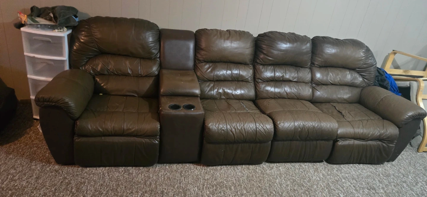 This brown leather loveseat recliner features two reclining seats and a centre console with cup holders. The recliner seats offer comfortable seating options. It's a great addition for any living room or entertainment space. The couch can be taken apart for easy transport into four easy parts!