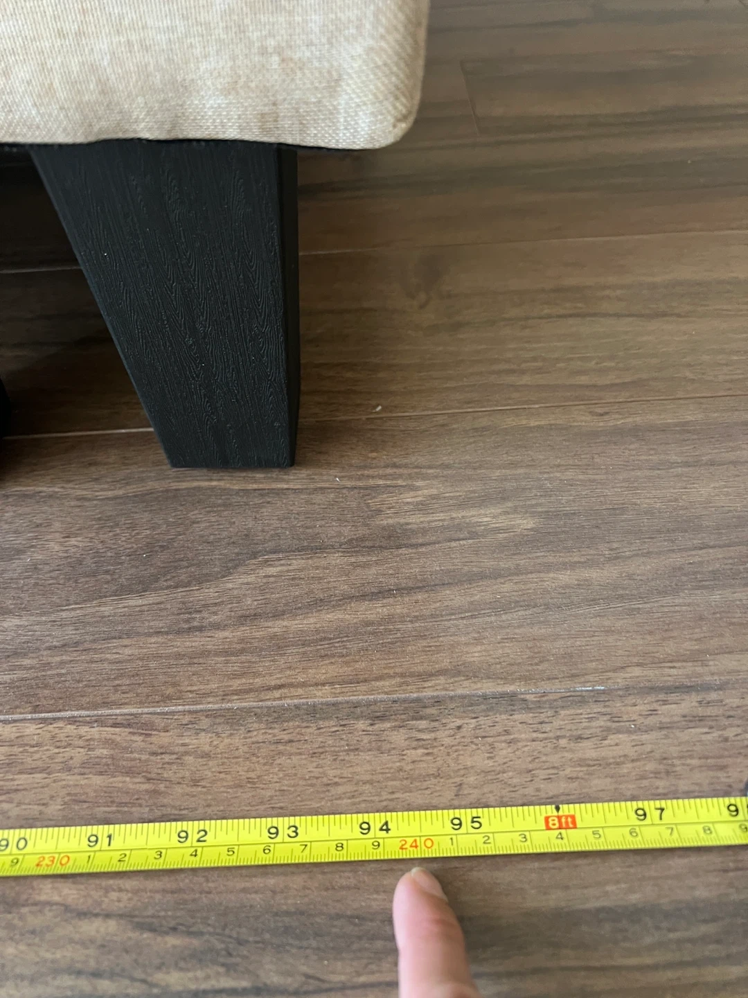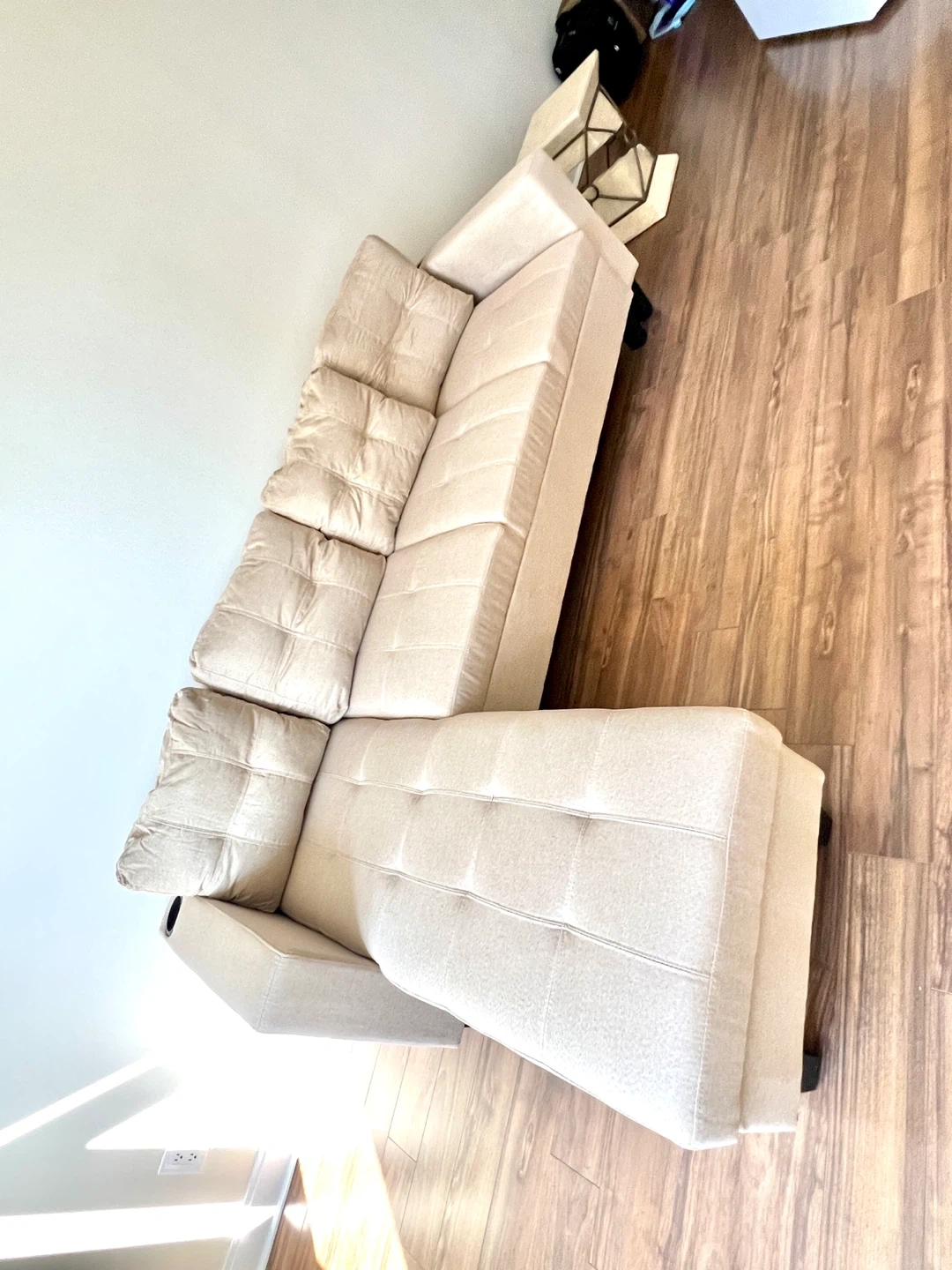 This New beige sectional 4 seaters sofa features a tufted design and includes a chaise. Its fabric is a durable polyester blend. It's comfy and spacious for any living room!