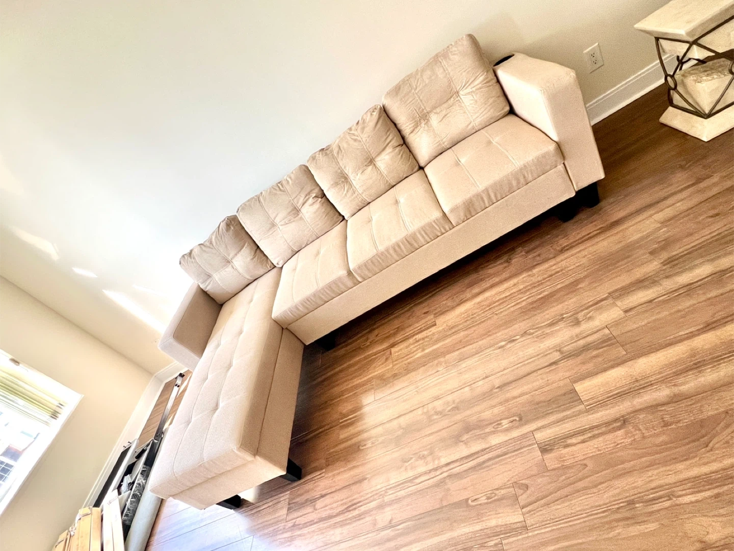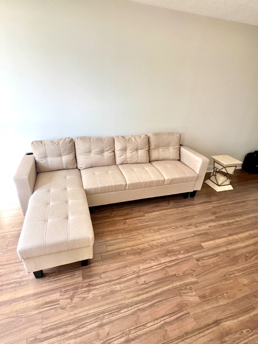 This New beige sectional 4 seaters sofa features a tufted design and includes a chaise. Its fabric is a durable polyester blend. It's comfy and spacious for any living room!
