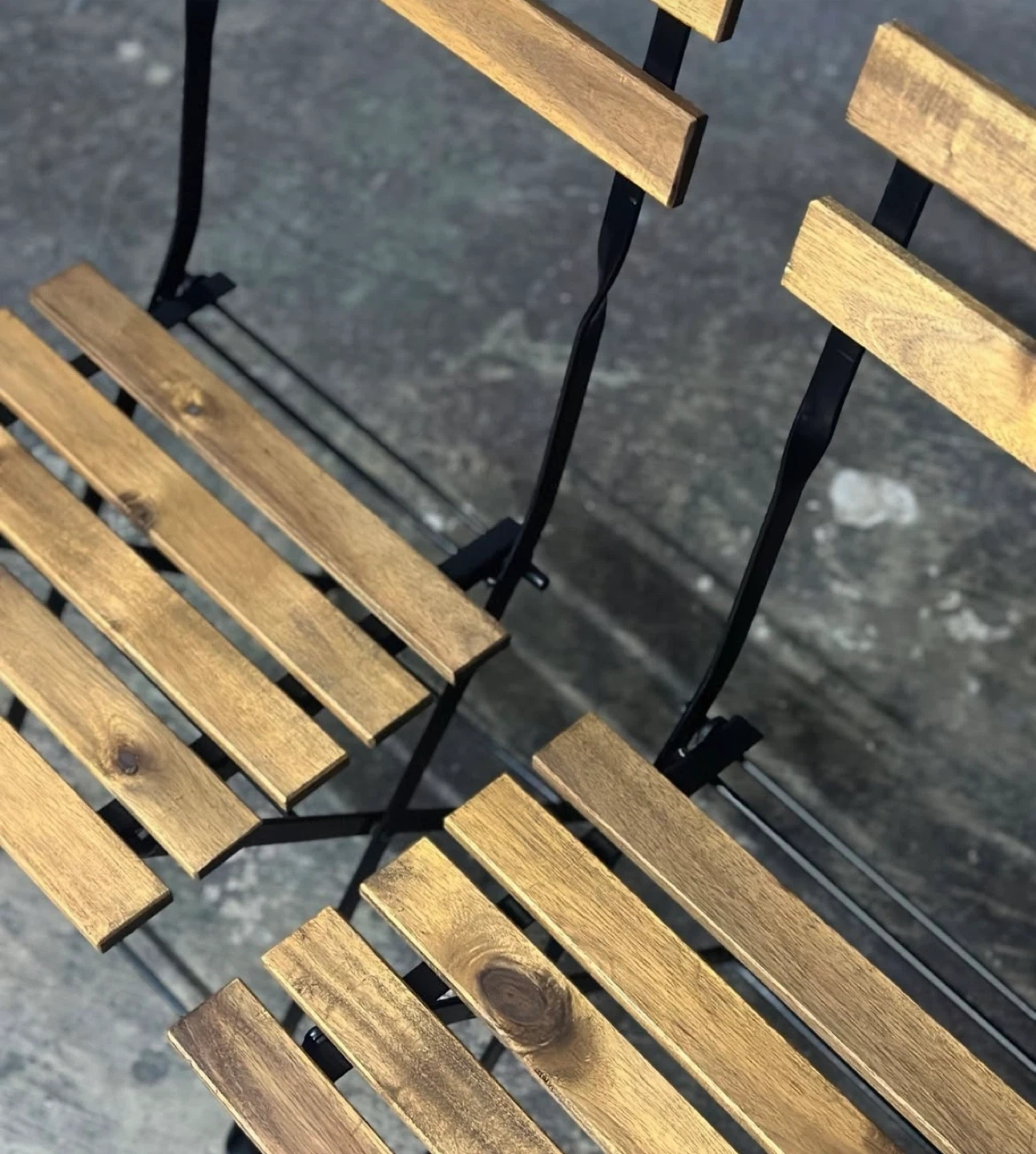 A pair of folding bistro chairs with wooden slatted seats and backs on black metal frames. They're perfect for small patios or balconies. Chairs are foldable for easy storage.