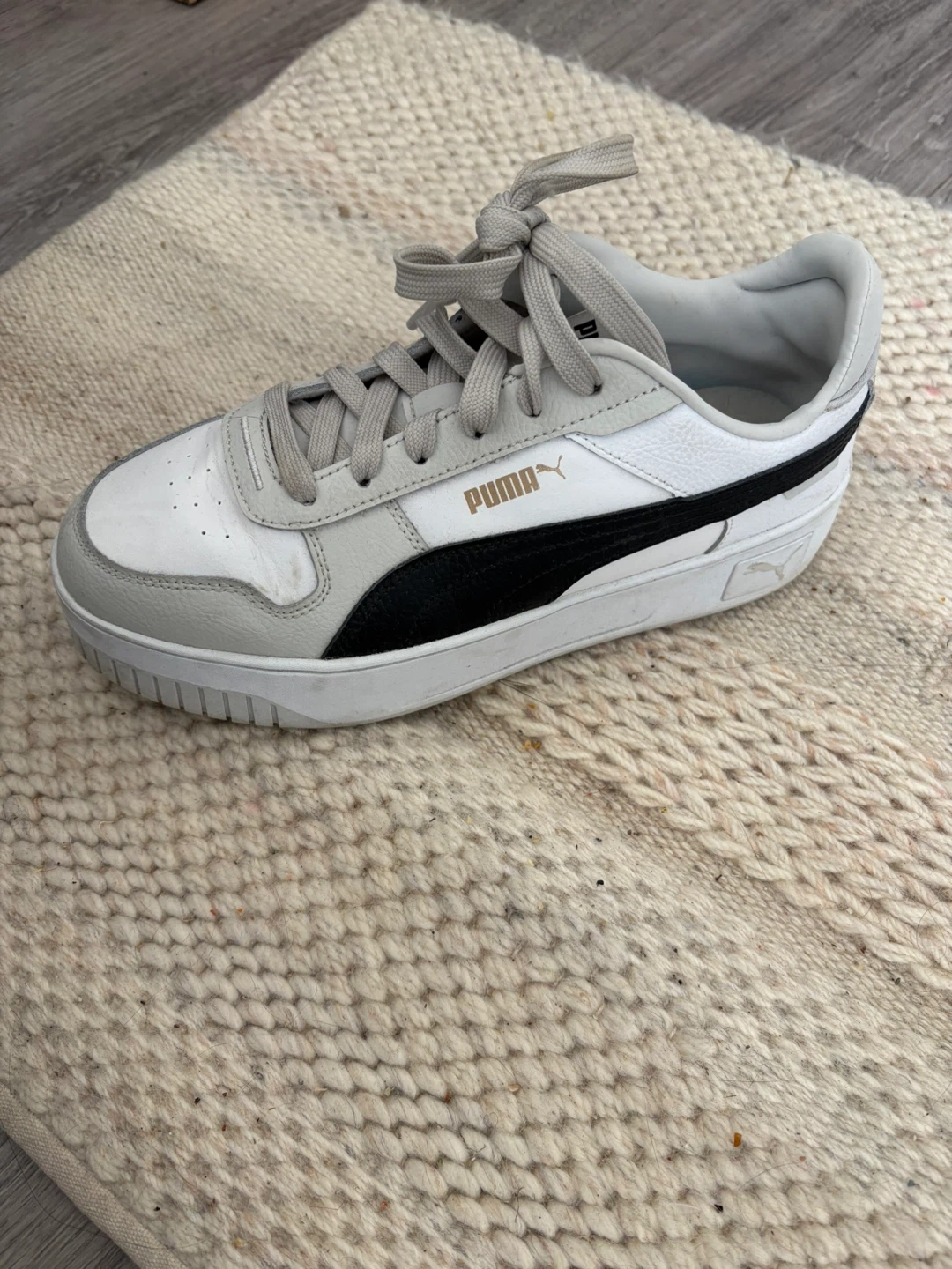 These Puma sneakers are white with grey accents and a black stripe. They have a classic lace-up closure. White rubber soles.