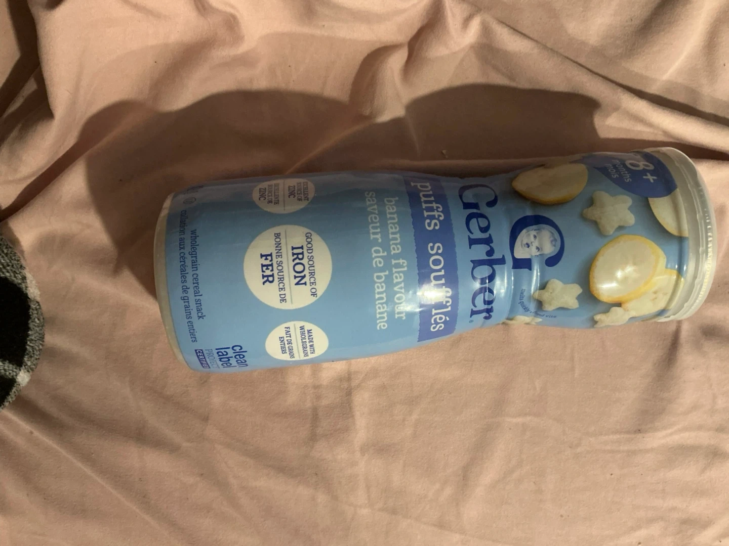 Gerber Puffs banana flavour whole grain cereal snack. Good source of iron. For babies 8+ months. Best before August 18 2026 pick up Downtown Victoria