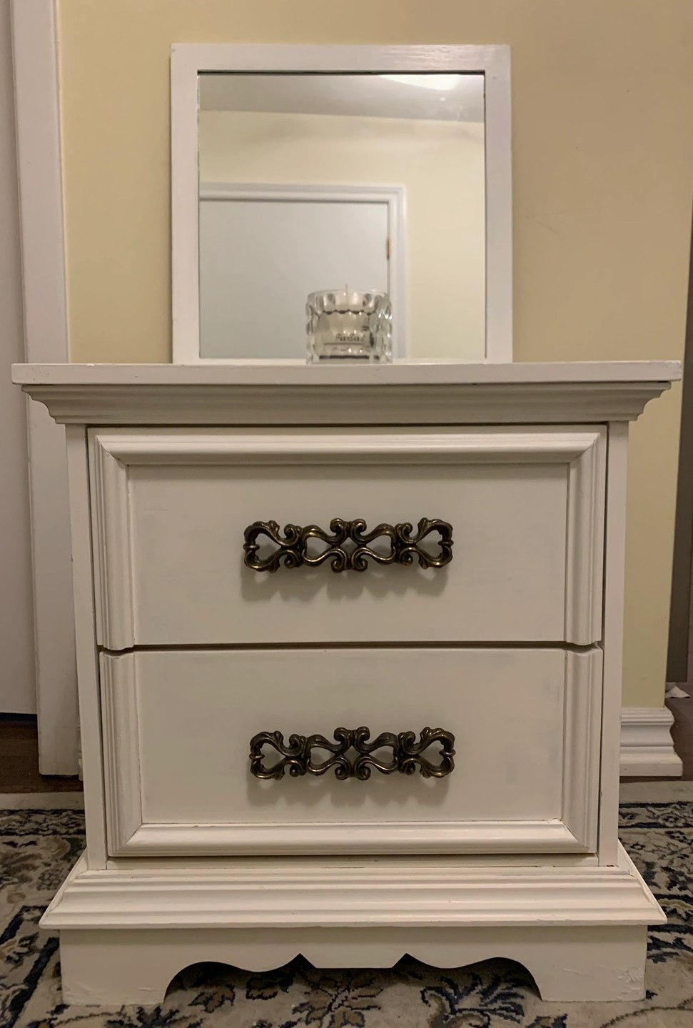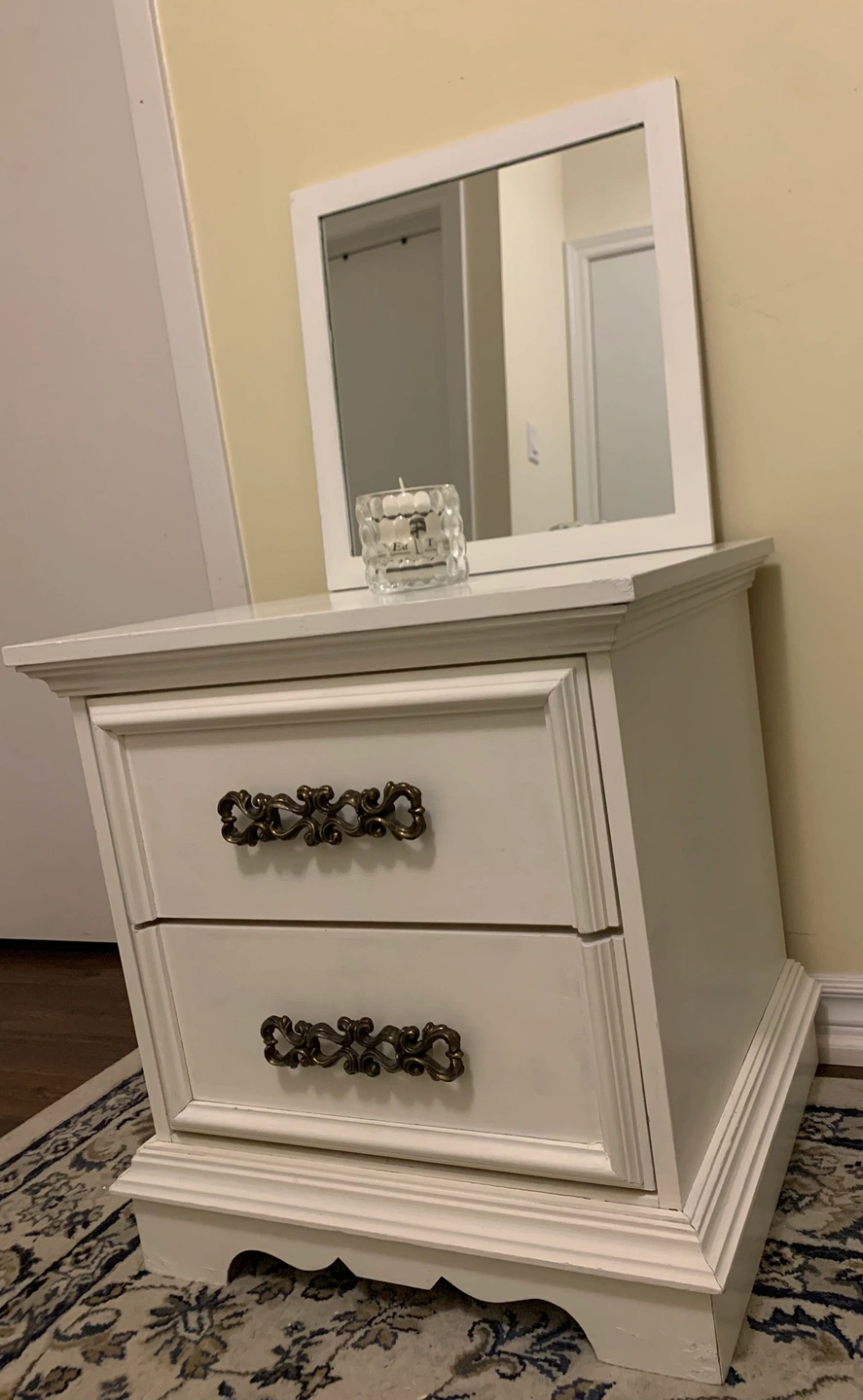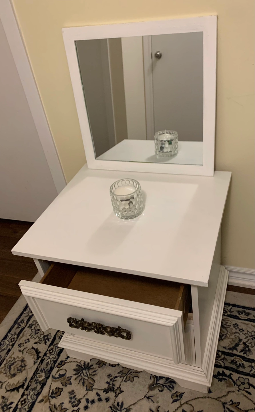 A white nightstand with a removable mirror. The nightstand has two drawers and ornate hardware. It is made of wood and has a slightly distressed finish.