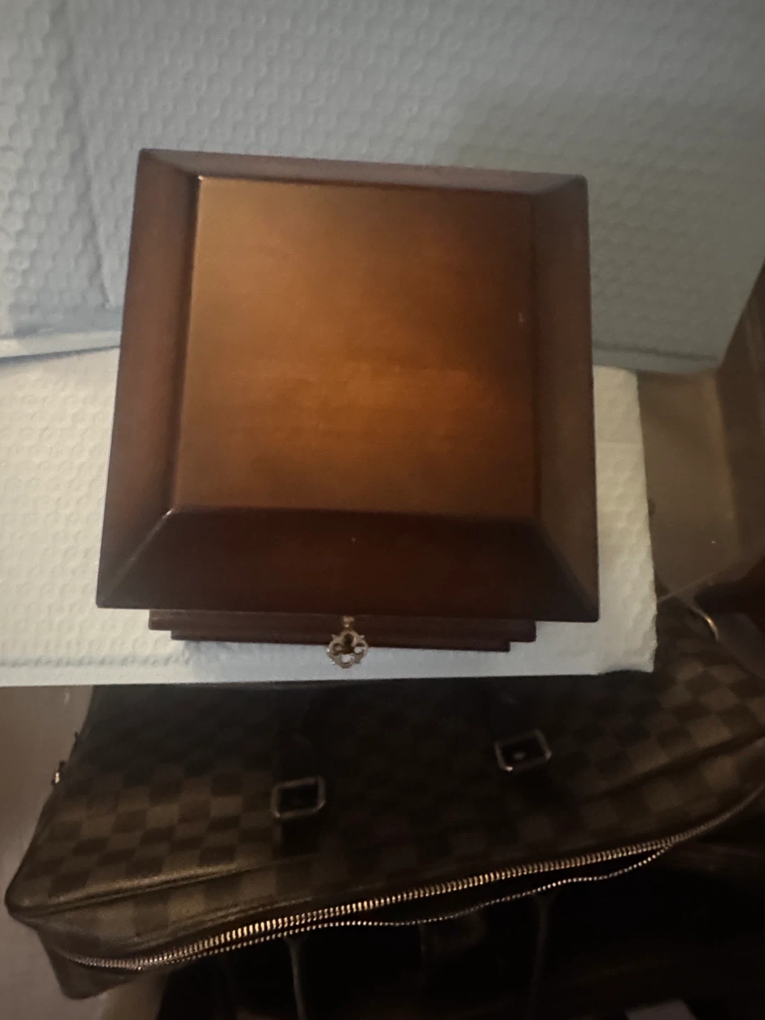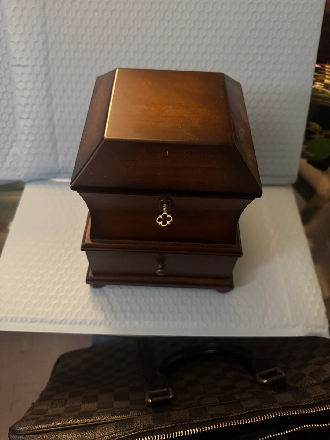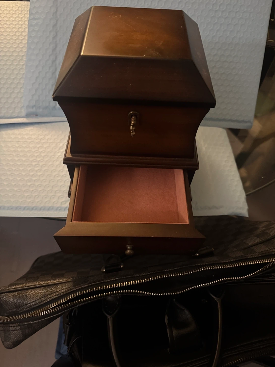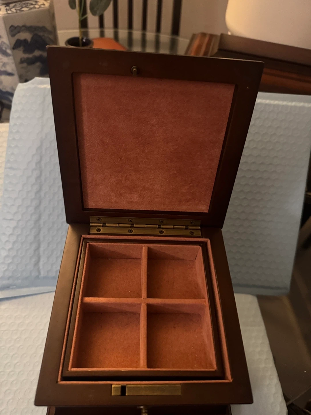 Selling a lovely Bombay jewellery box. It's a dark brown wood, with a soft, red velvet interior. Perfect for storing your precious items!