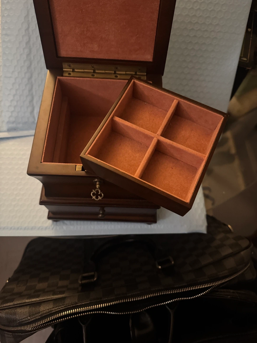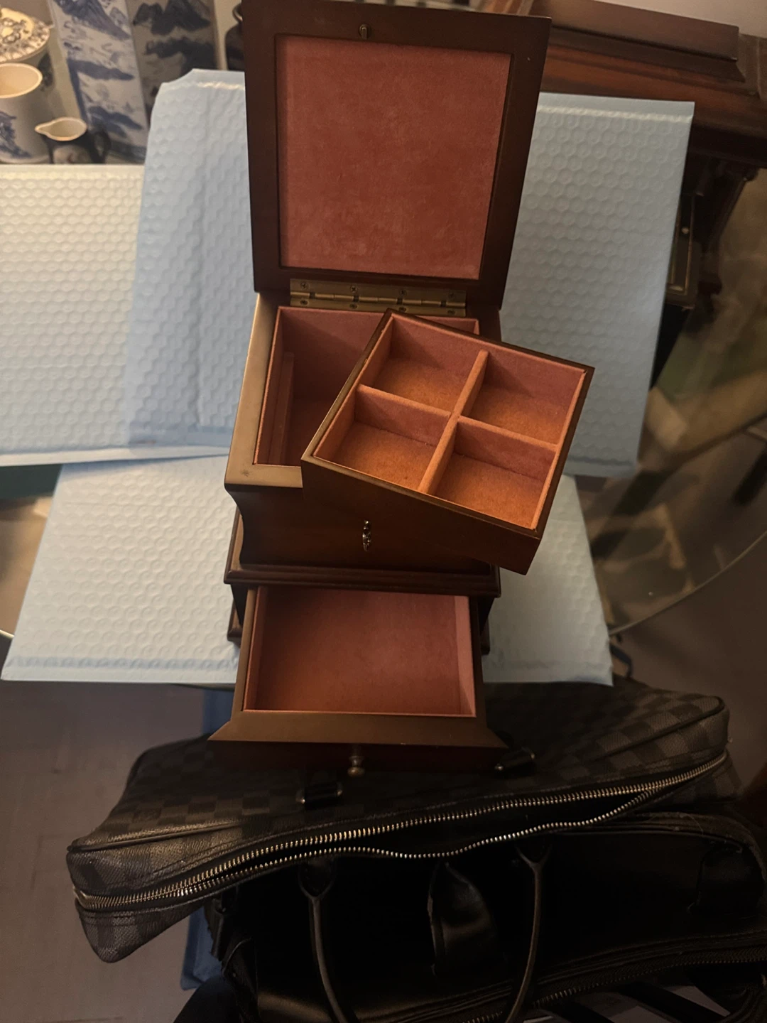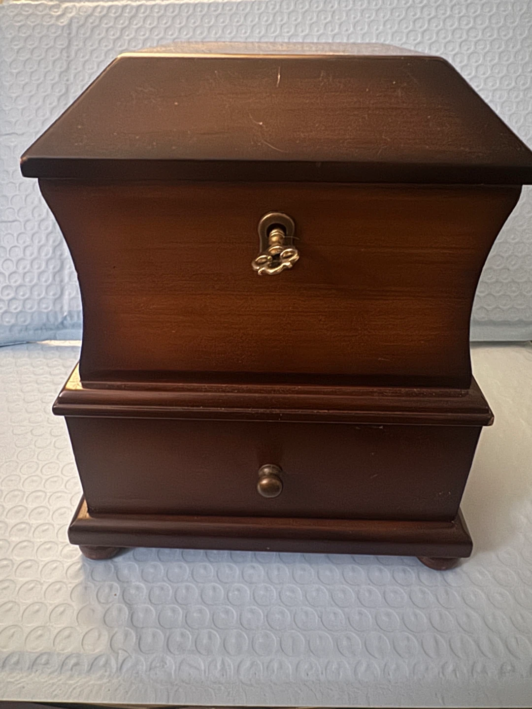 Selling a lovely Bombay jewellery box. It's a dark brown wood, with a soft, red velvet interior. Perfect for storing your precious items!