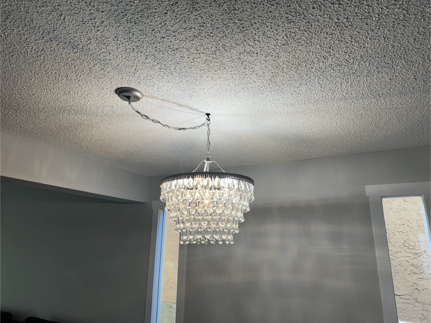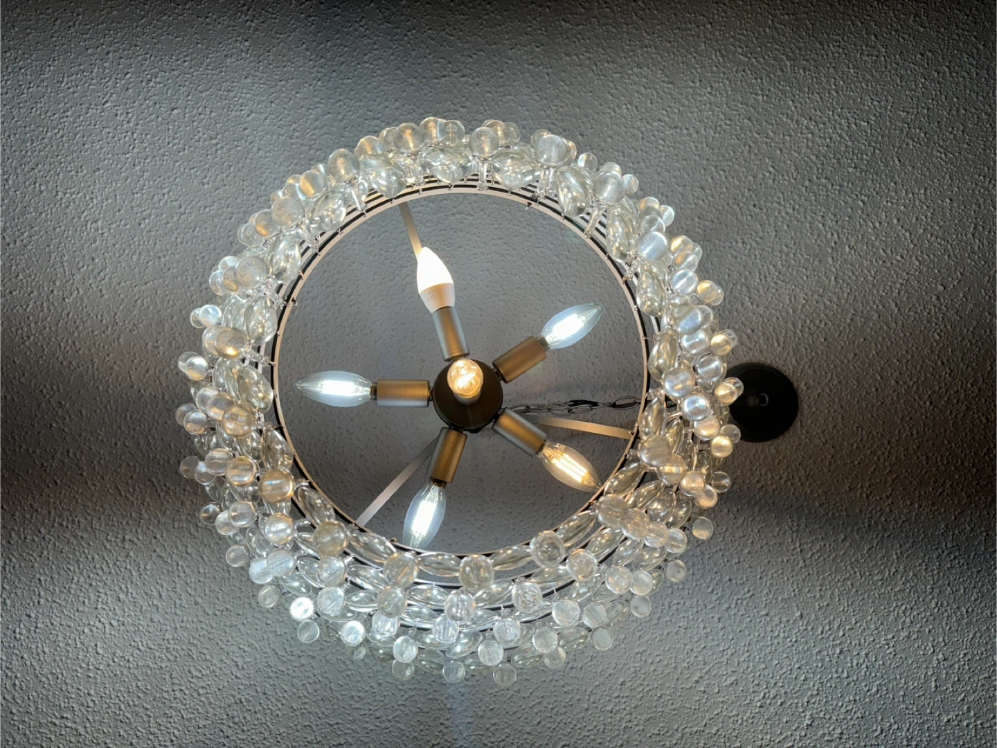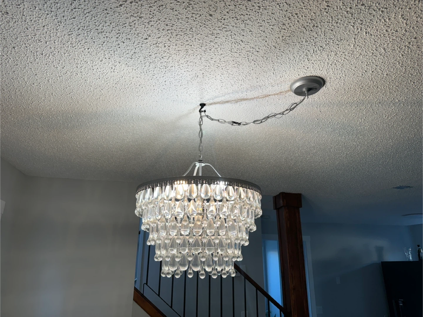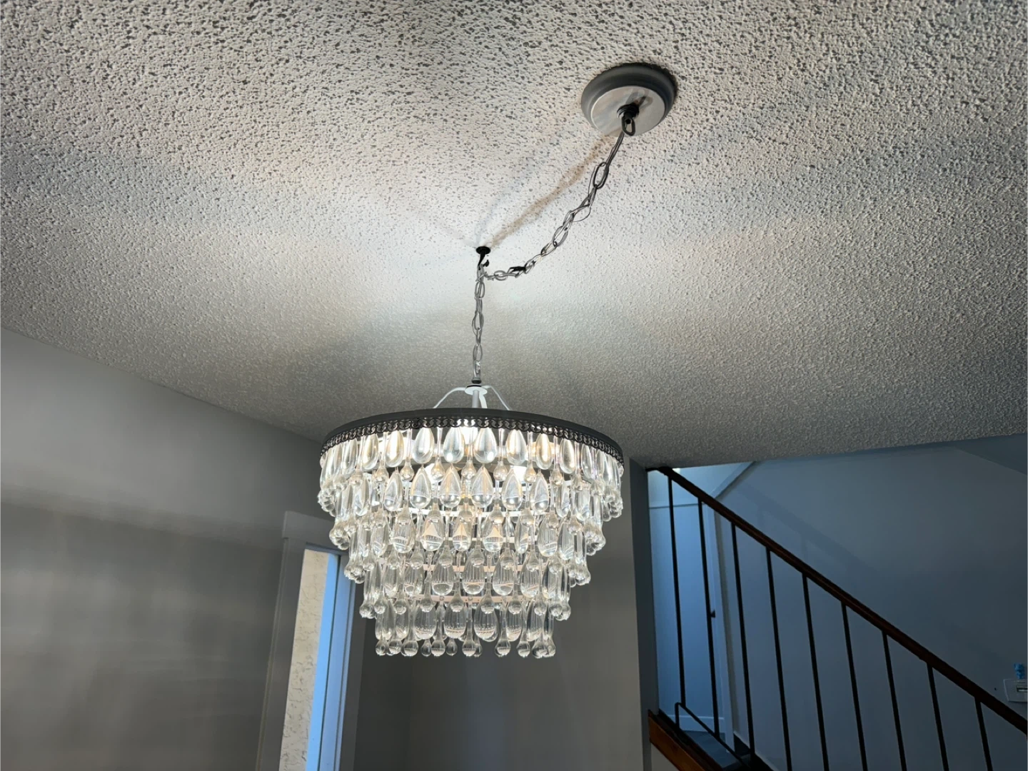 This chandelier features multiple tiers of teardrop-shaped crystal accents. It hangs from a metal chain and has a brushed nickel finish. This fixture would add a touch of elegance to a dining room or living space.