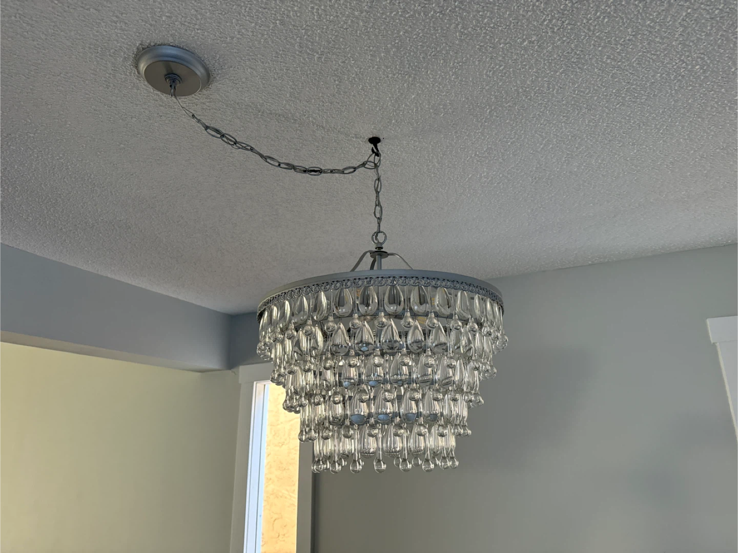 This chandelier features multiple tiers of teardrop-shaped crystal accents. It hangs from a metal chain and has a brushed nickel finish. This fixture would add a touch of elegance to a dining room or living space.