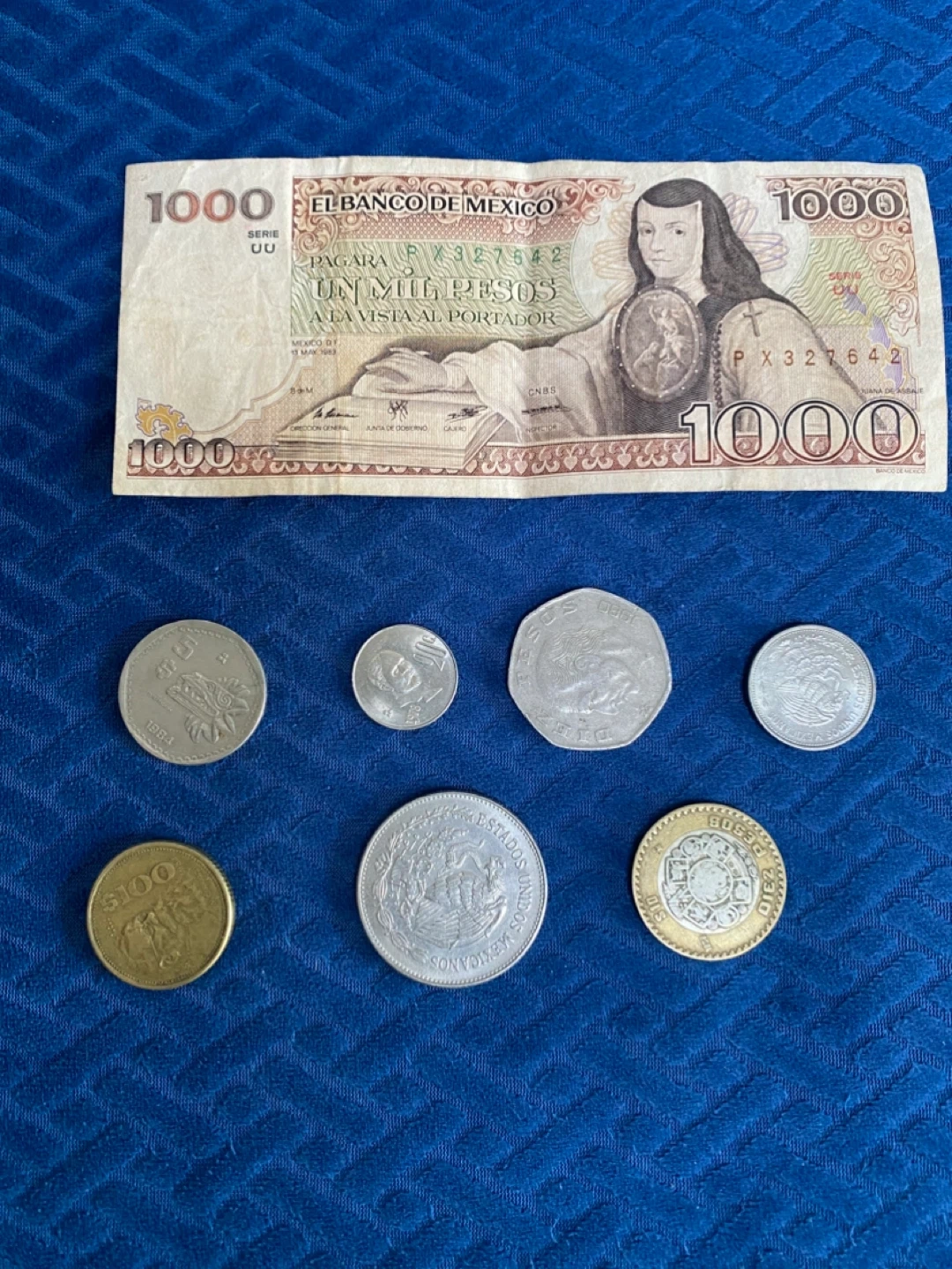 This listing features a collection of Mexican currency, including one 1000 Pesos banknote and several assorted coins. The banknote displays historical imagery from Mexico. These items are suitable for collectors interested in numismatics.