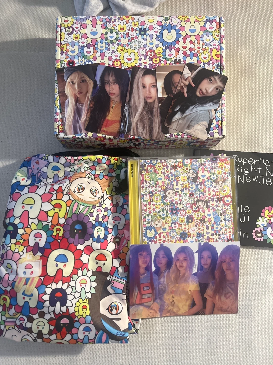 K-pop merchandise set featuring the 'Super Shy' album. Includes photobook, CD, and photocards. Features a colourful, distinctive Murakami-style floral pattern. Perfect for NewJeans fans!