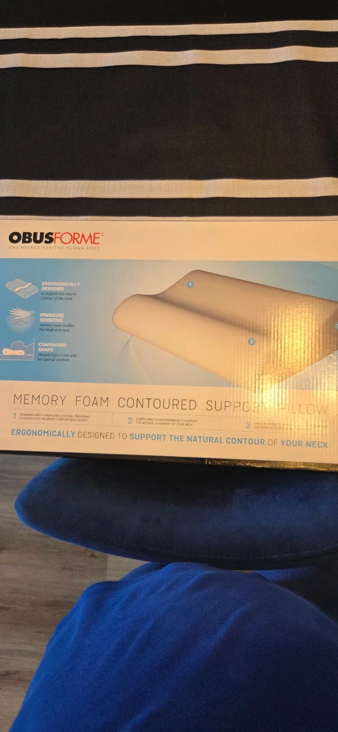 ObusForme Memory Foam Contoured Support Pillow. Engineered for the human body. Memory foam provides comfort and firm support. Ergonomically designed to support natural neck alignment.