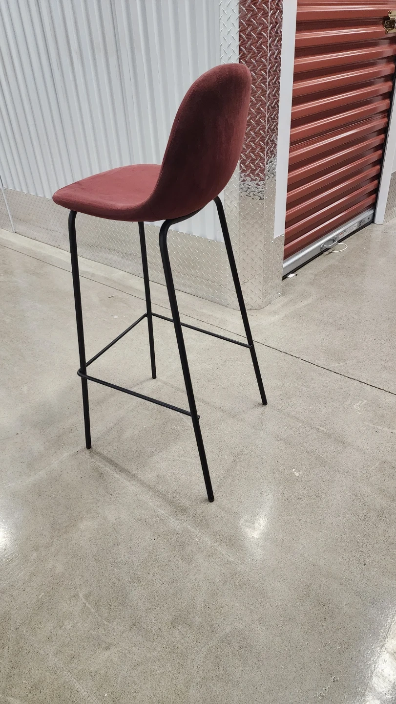 This bar stool features a comfortable, burgundy upholstered seat and a sturdy black metal frame. The fabric has a soft, suede-like texture. It's designed for a counter or bar height setting.