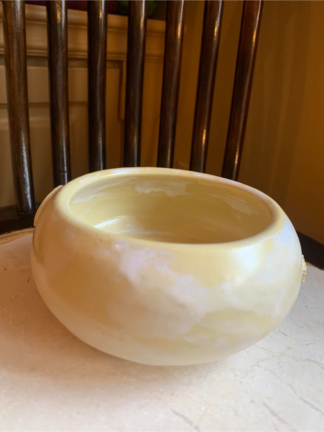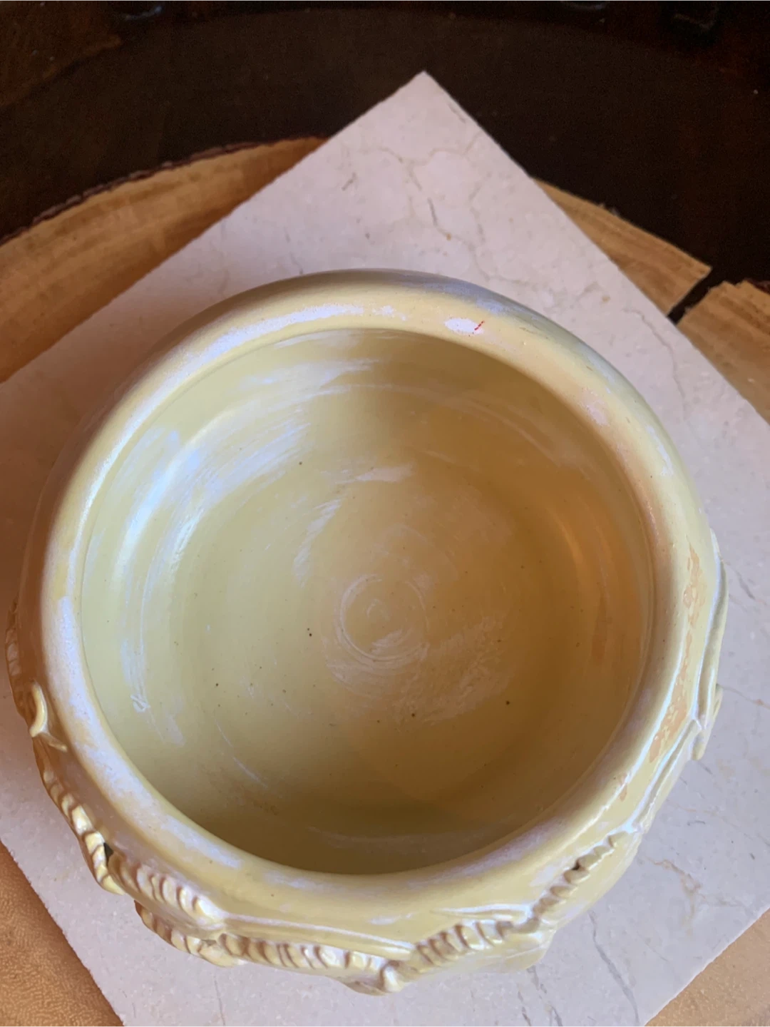 A handcrafted ceramic bowl featuring embossed leaf designs. It's a unique decorative piece in a soft yellow tone. Measures approximately 4.5 inches in diameter and just under 3” in height. There are no chips or cracks. It would make a beautiful catch all for keys, jewelry, shelf sitter or for a succulent plant.