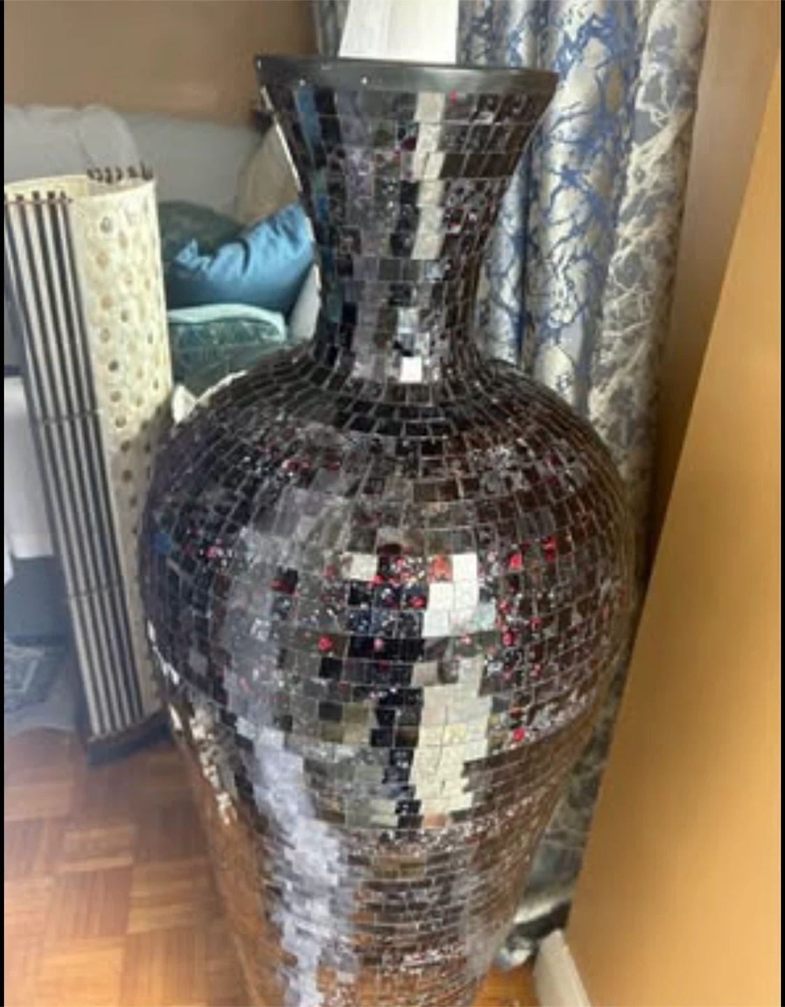 Selling a striking mosaic vase in black! It would be a great statement piece for any room. It's in great condition and ready to add some sparkle to your space