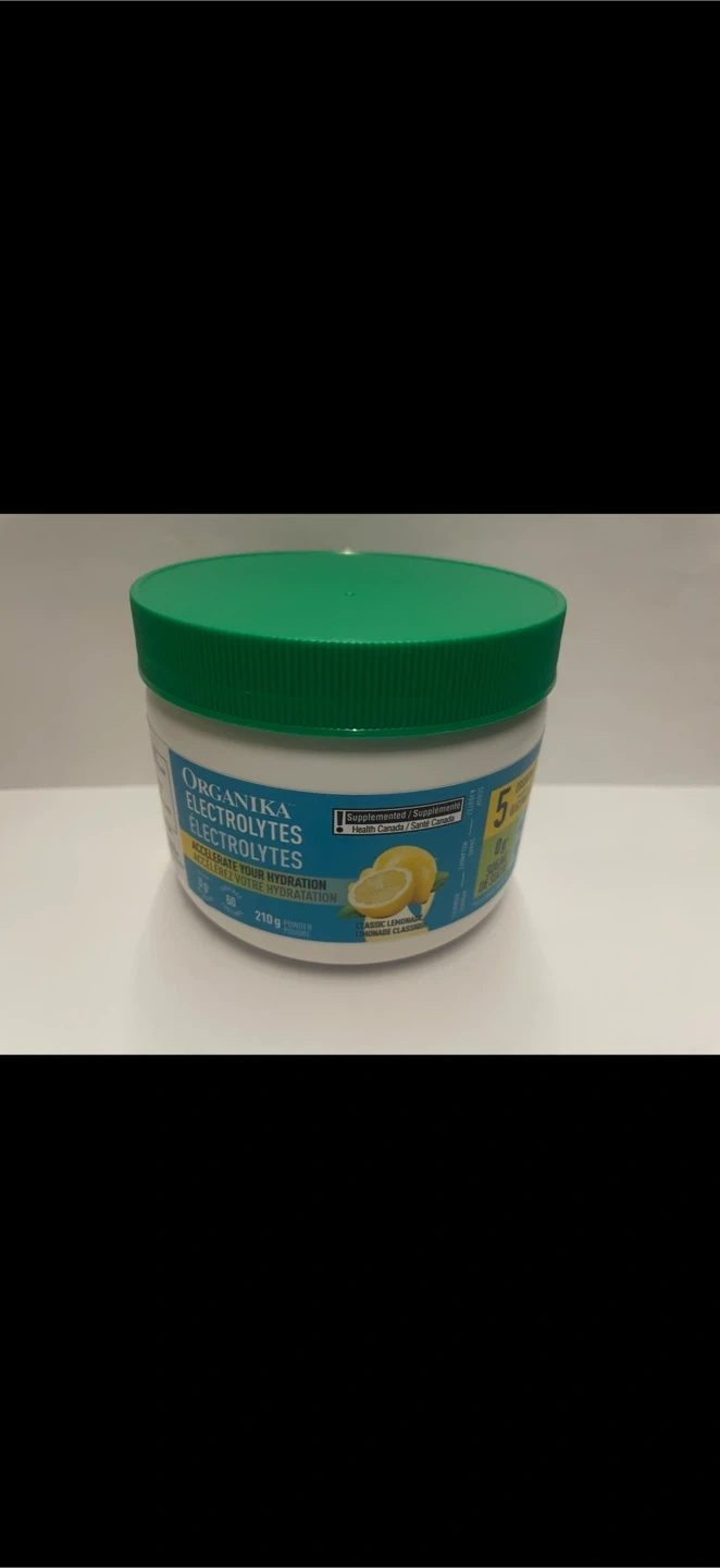 Organika Electrolytes powder in a lemon flavour. It's a source of 5 essential electrolytes and prebiotic fibre. This container has 215g of product.