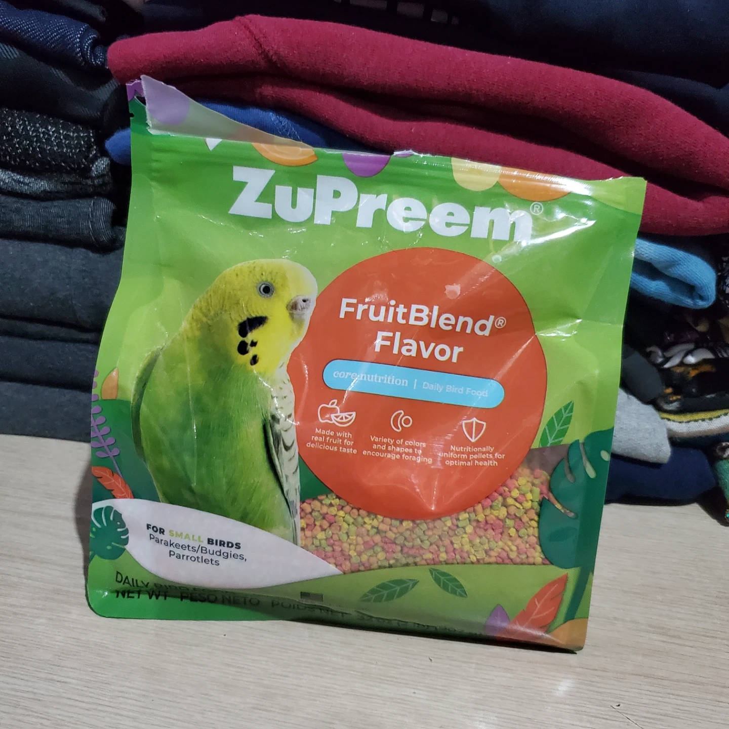 ZuPreem FruitBlend Flavor daily bird food. Made with real fruit for a delicious taste. Comes in a variety of colours and shapes to encourage foraging. It's nutritionally uniform pellets for optimal health! Almost full bag. Bought for my budgie but she passed.