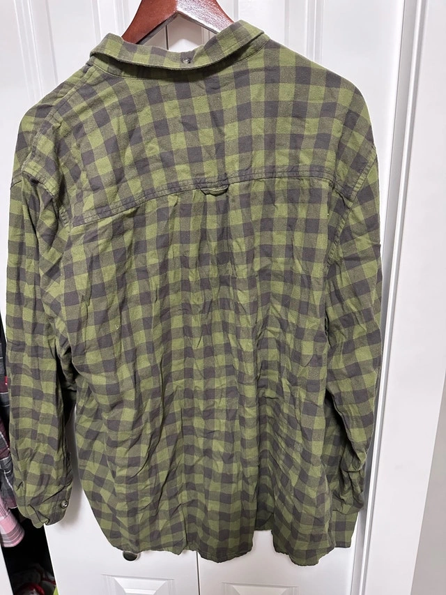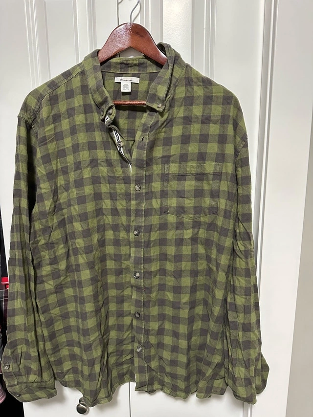 This is a green and charcoal plaid long-sleeve shirt from Riplzone. It's a size XXL. The shirt has a chest pocket and buttons up the front. Condition: Used - Good. For Sale By: Owner. Curbside pick up: Yes. Cash accepted: Yes.