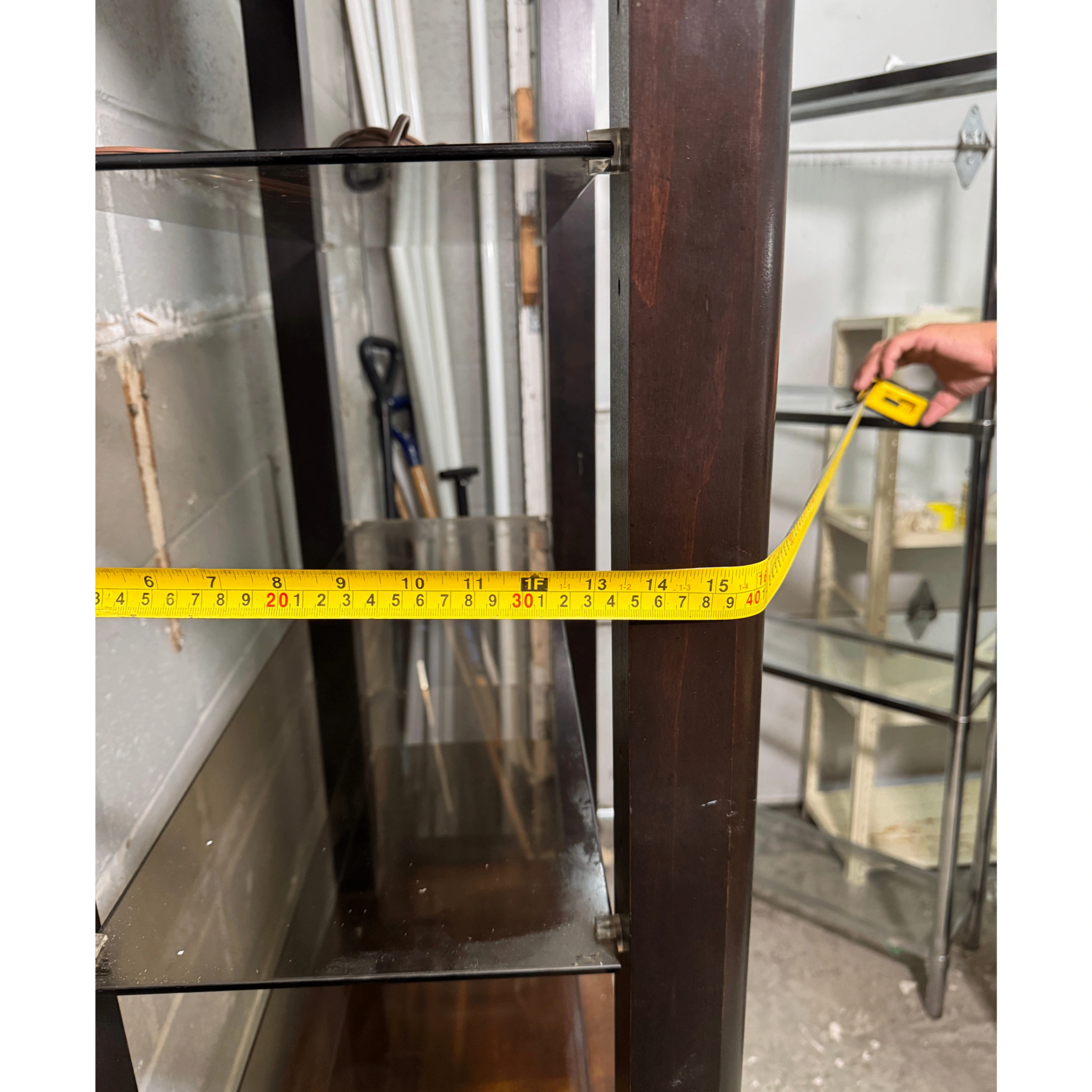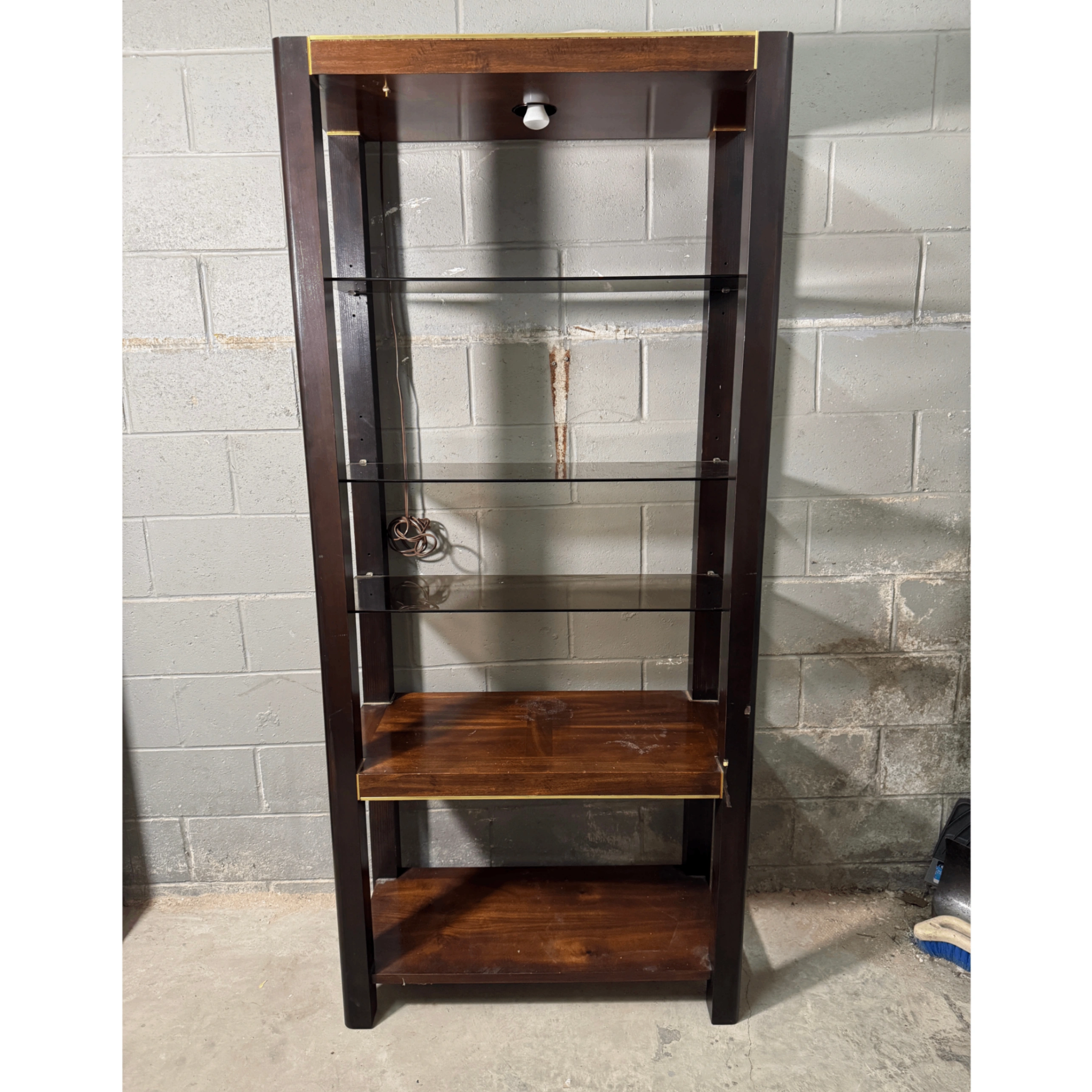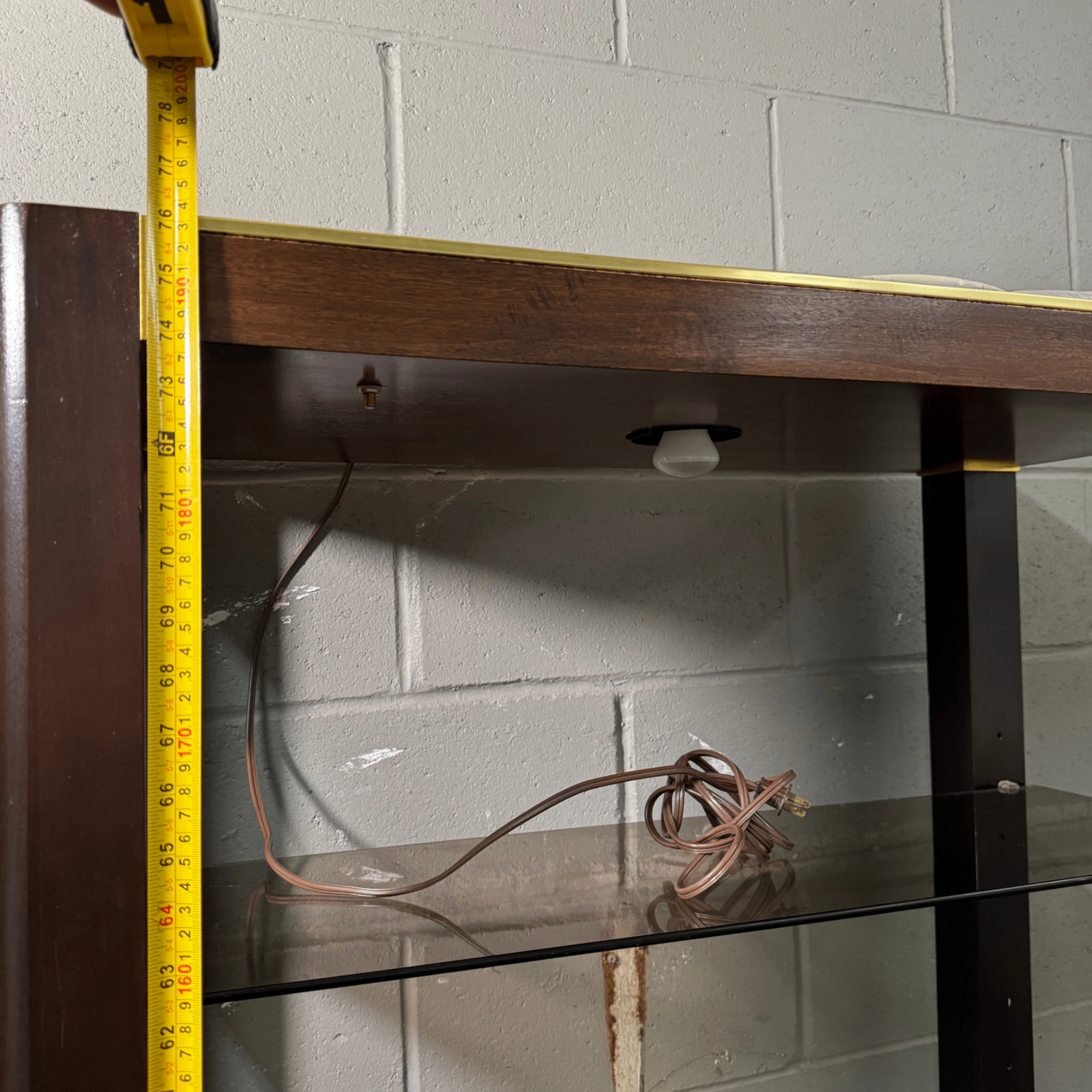 Selling a display shelf with a dark brown wood frame and glass shelves. It has a light at the top. It measures approximately 76 inches tall and 34 inches wide.