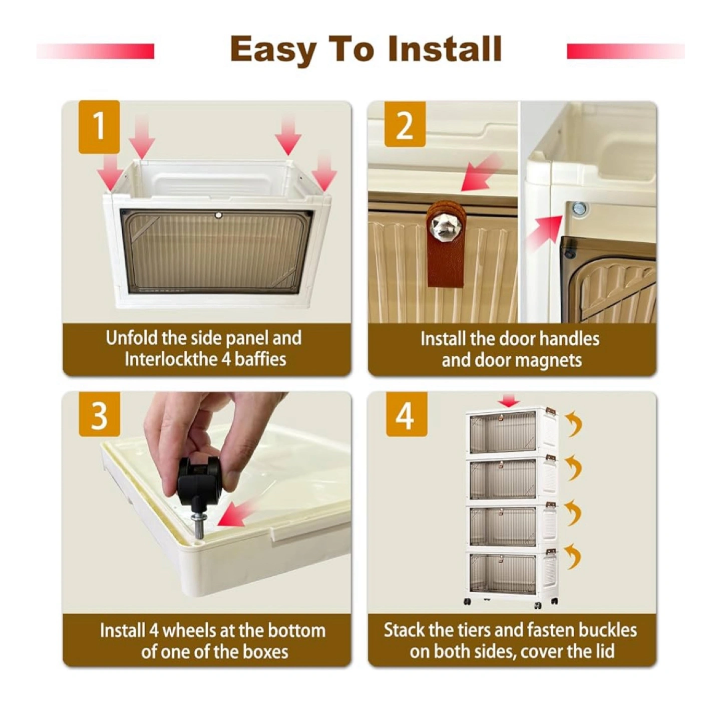 Declutter your space with this versatile stackable storage cabinet! It features a unique design with a leather handle and lockable buckle. The powerful magnetic closure keeps everything secure, and the rotatable & lockable wheels make it easy to move around. Perfect for any room in your home!