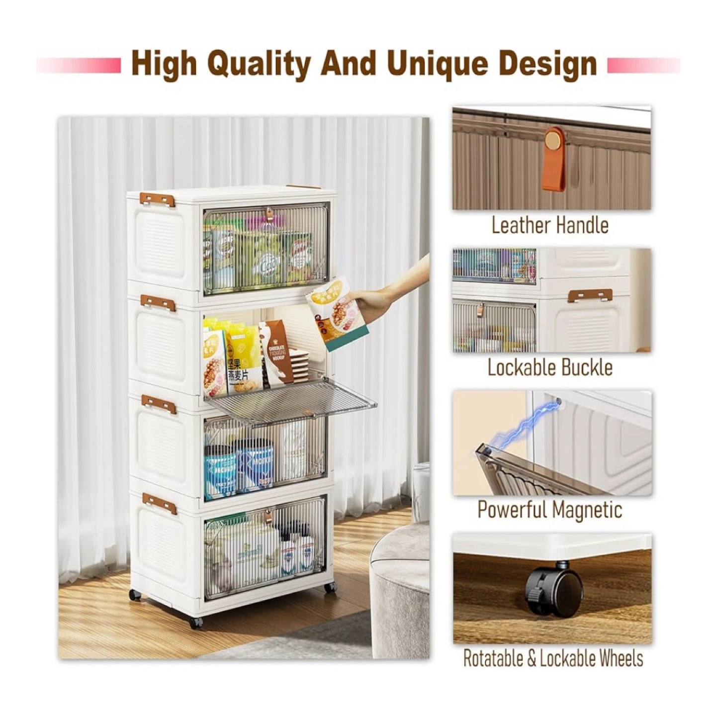 Declutter your space with this versatile stackable storage cabinet! It features a unique design with a leather handle and lockable buckle. The powerful magnetic closure keeps everything secure, and the rotatable & lockable wheels make it easy to move around. Perfect for any room in your home!