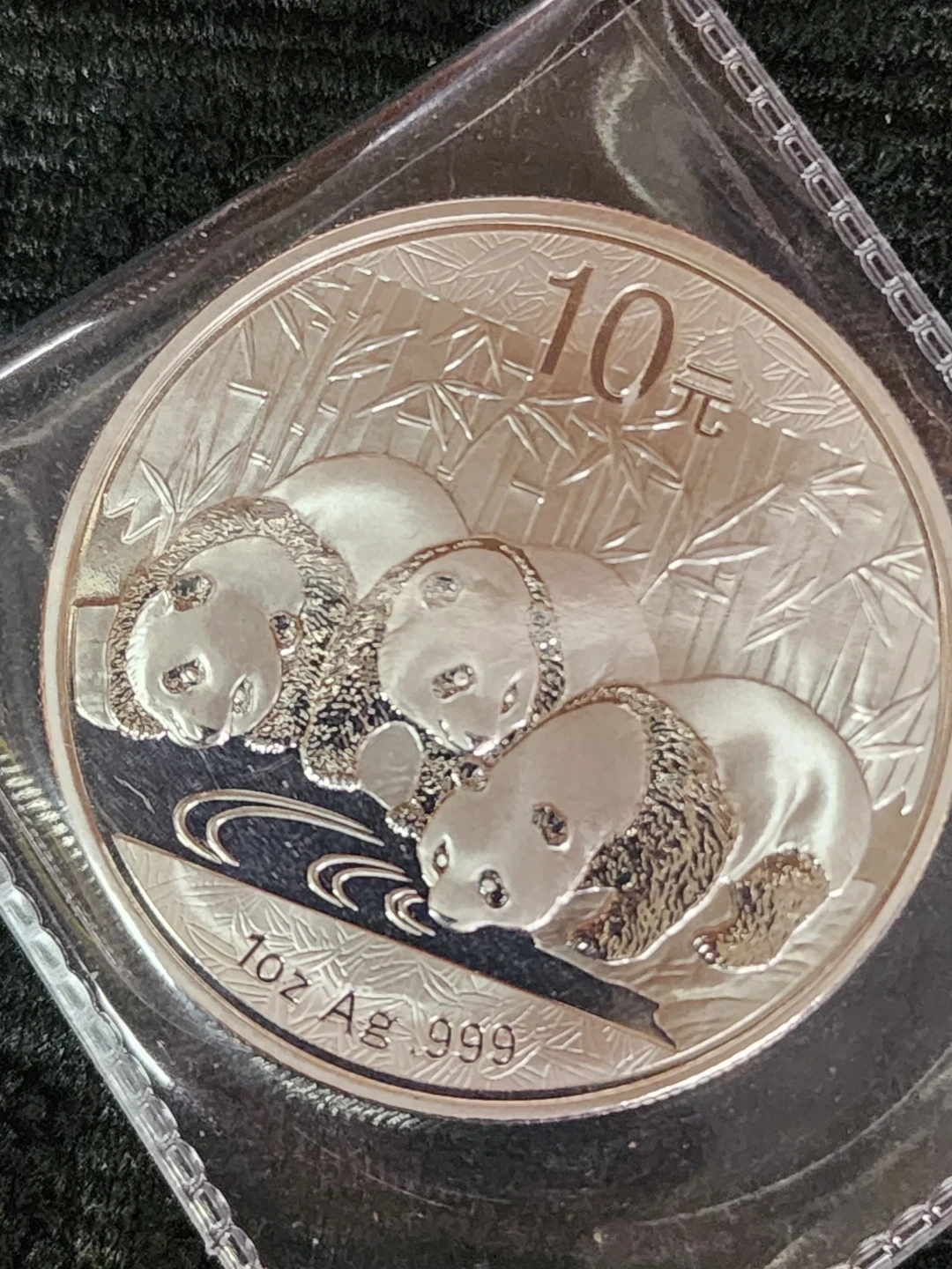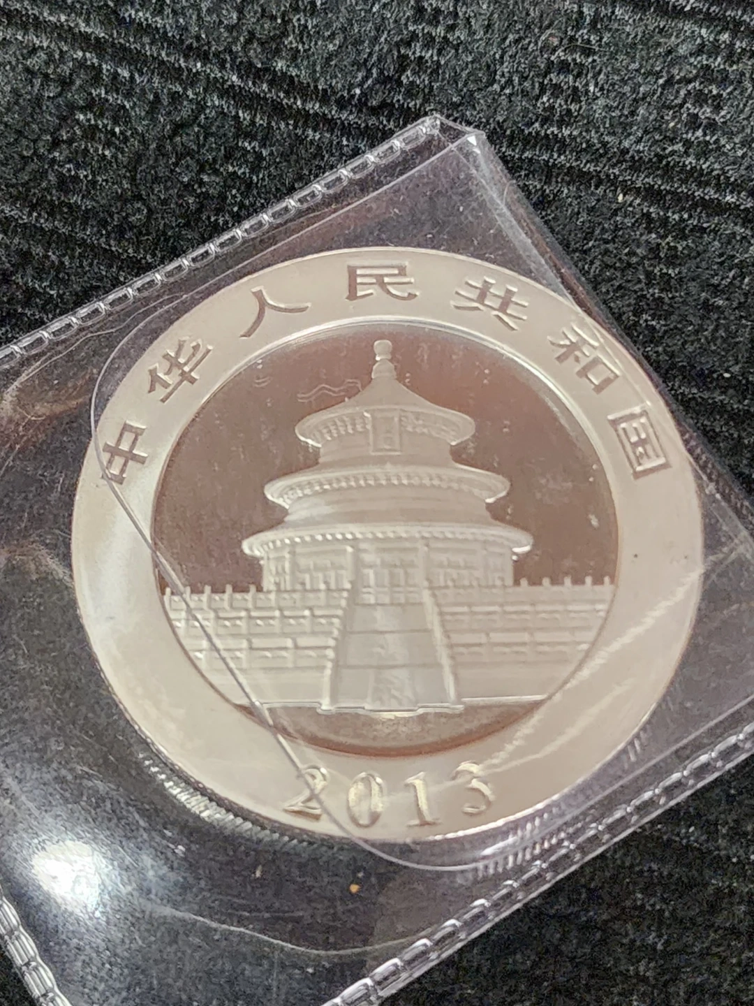 Selling a 2013 Chinese Panda 10 Yuan silver coin. It features three pandas on one side and the Temple of Heaven on the other. The coin is in a protective case.