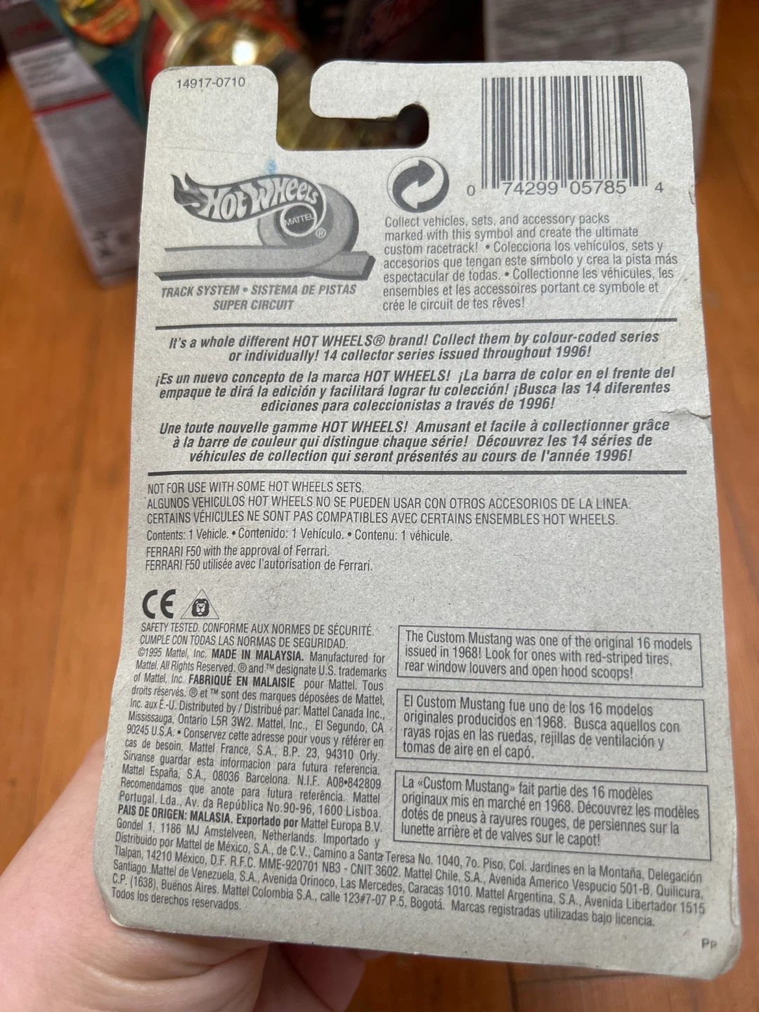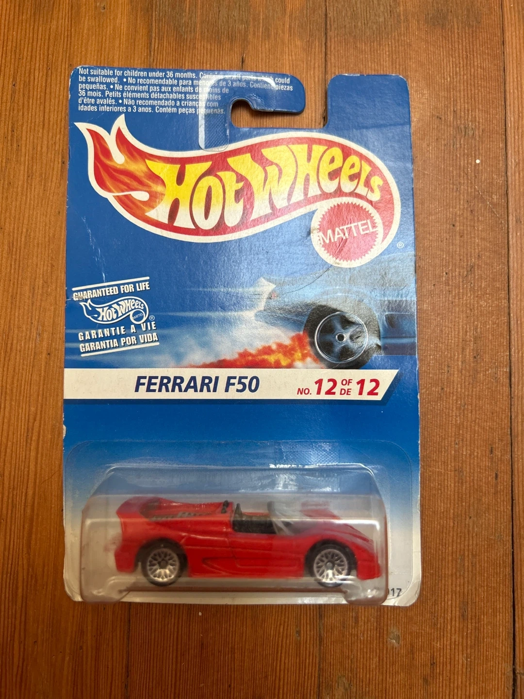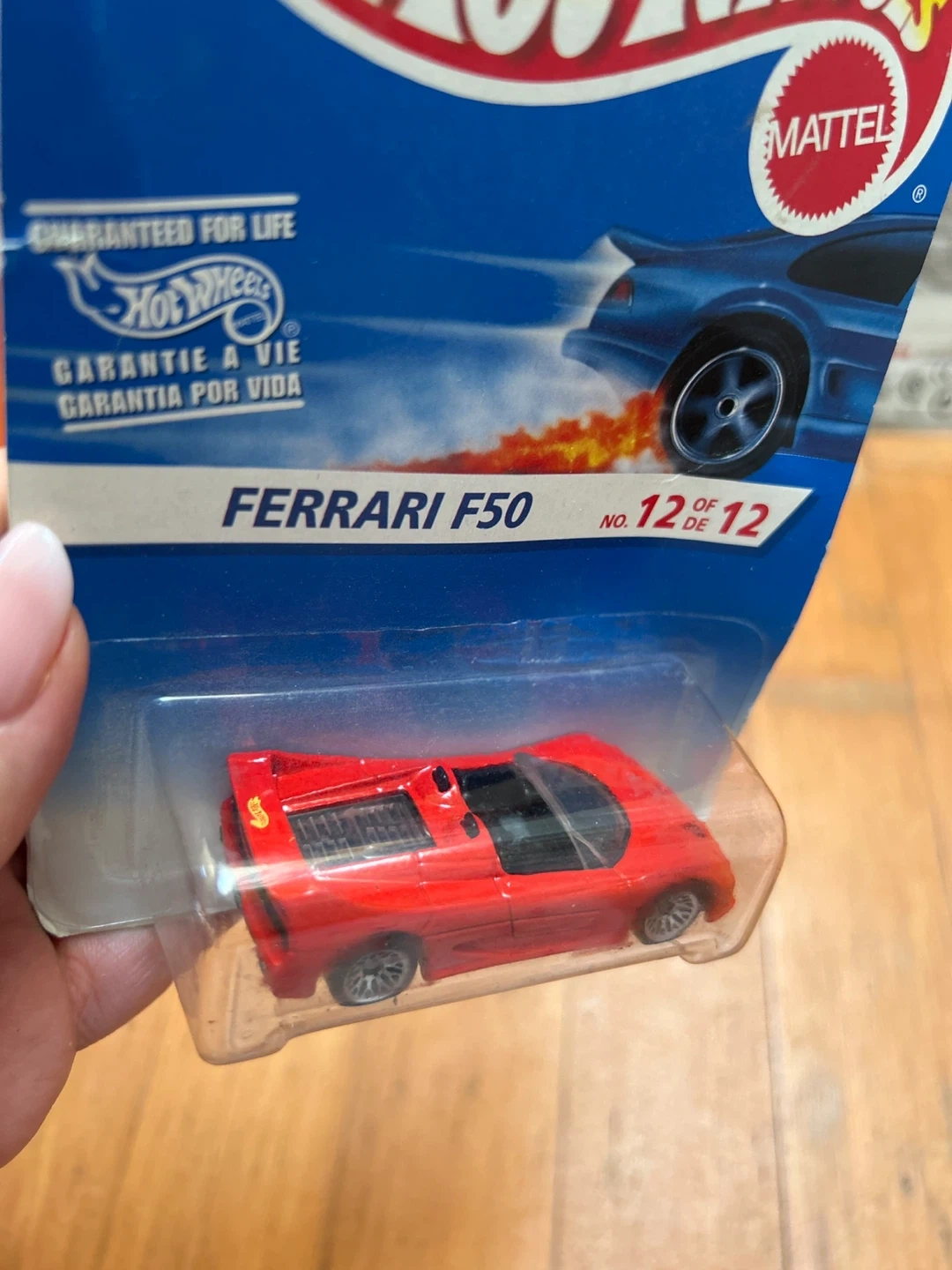 This is a red Hot Wheels die-cast toy car featuring the Ferrari F50 model. It's part of the 1996 collection and is number 12 of 12. Comes in original packaging.