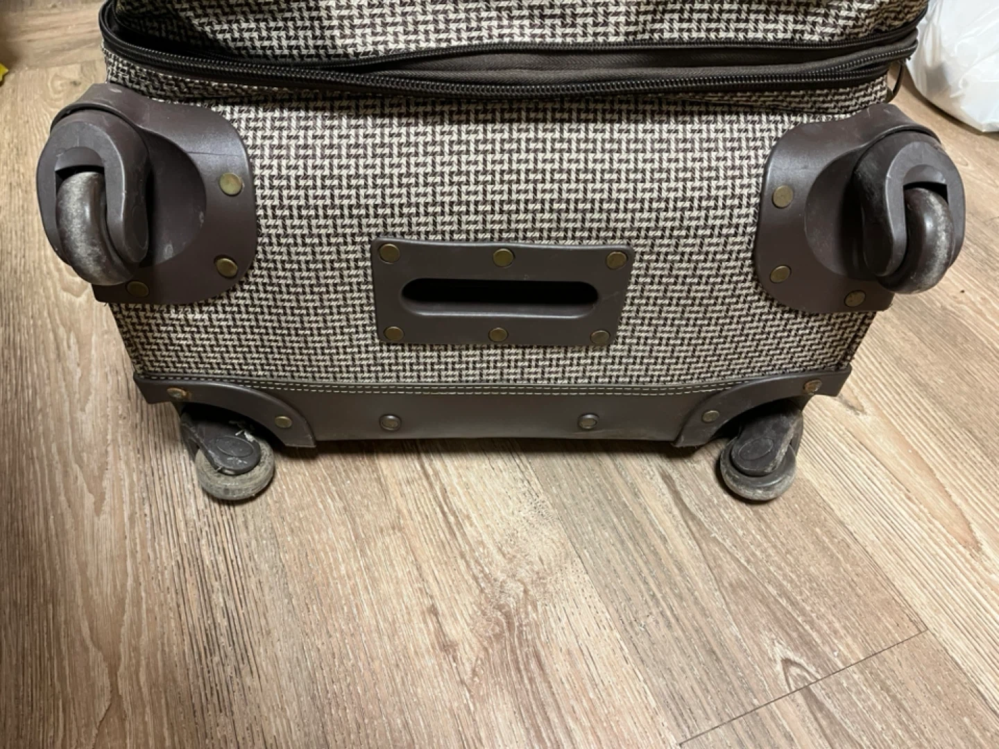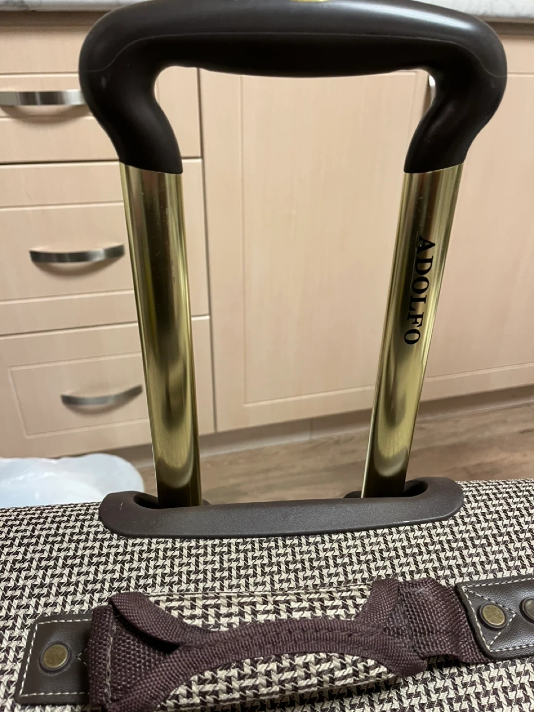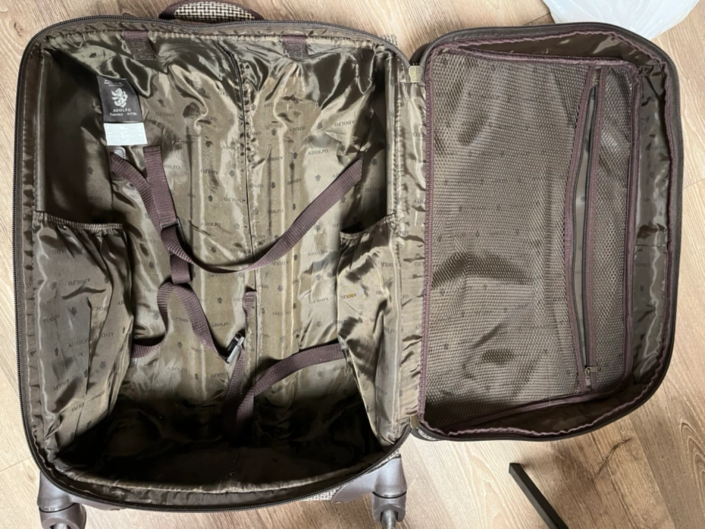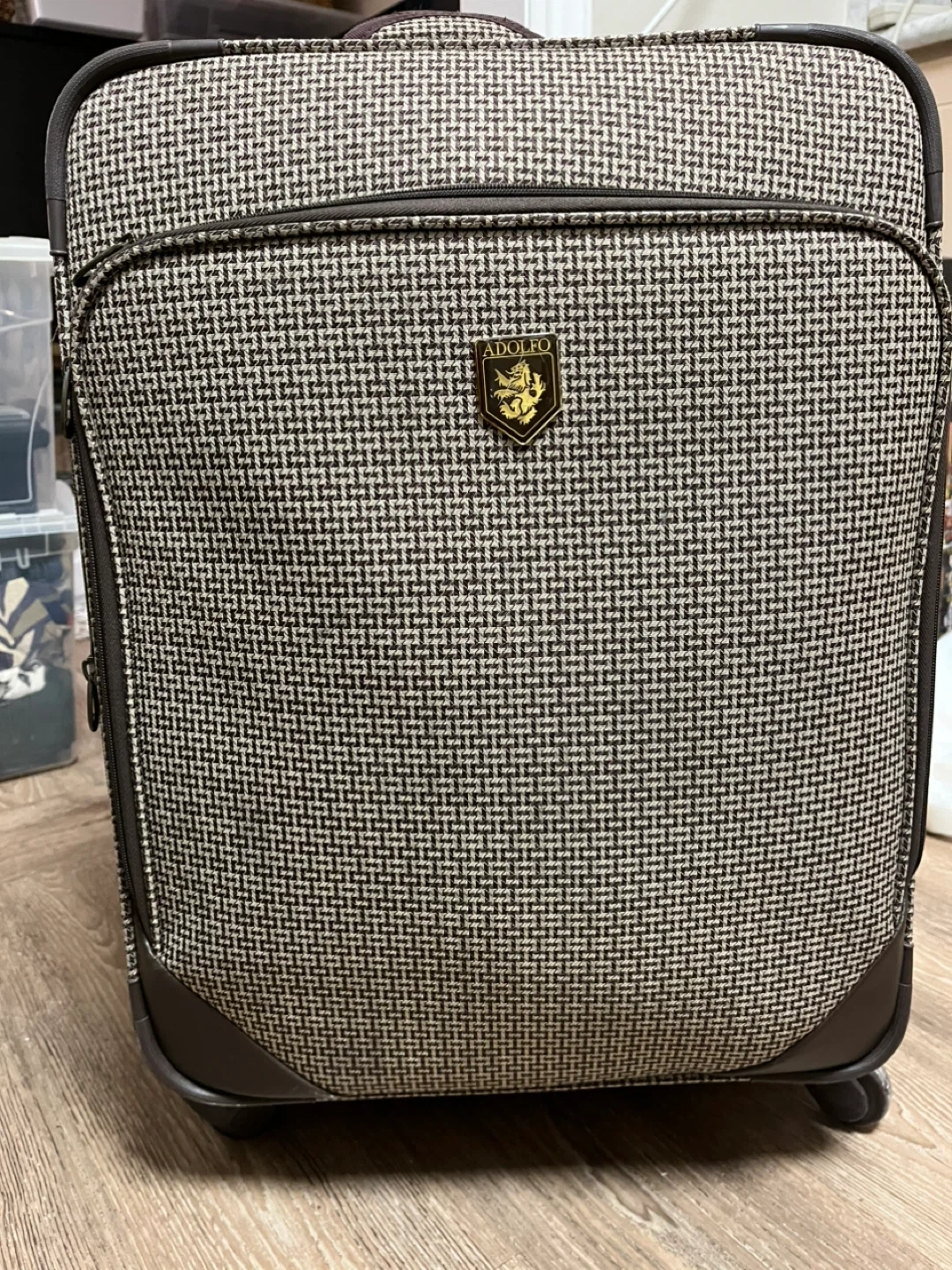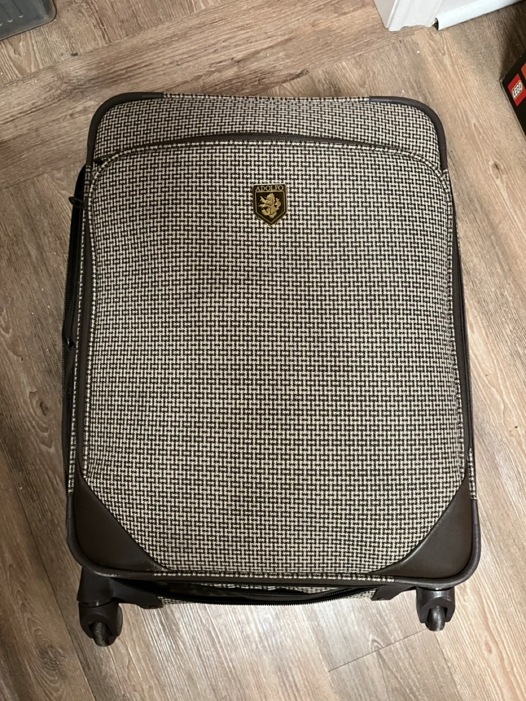 This is an ADOLFO brand suitcase with a houndstooth pattern. It features a telescopic handle and spinner wheels for easy transport. The interior has straps and zippered pockets for organization.