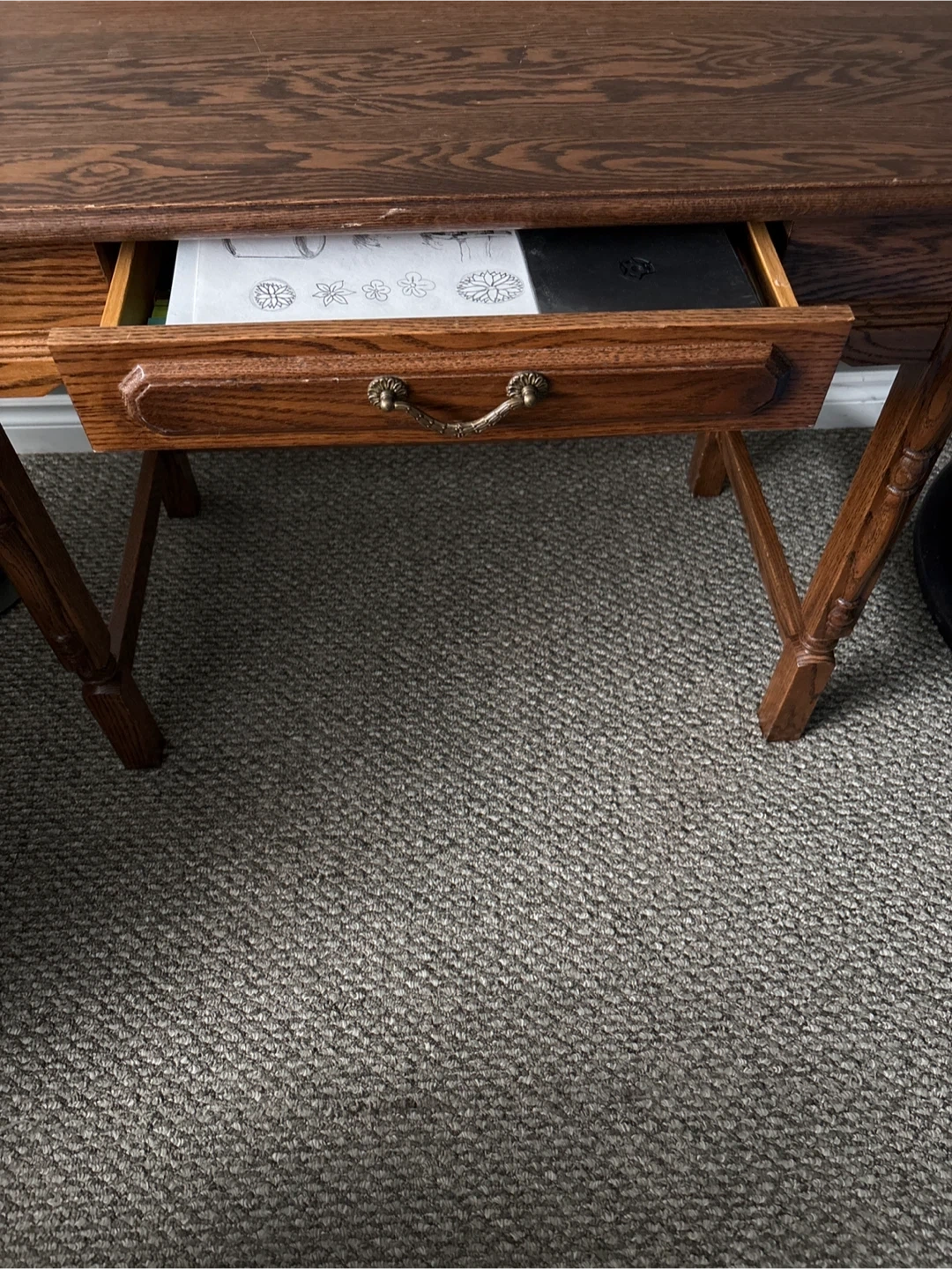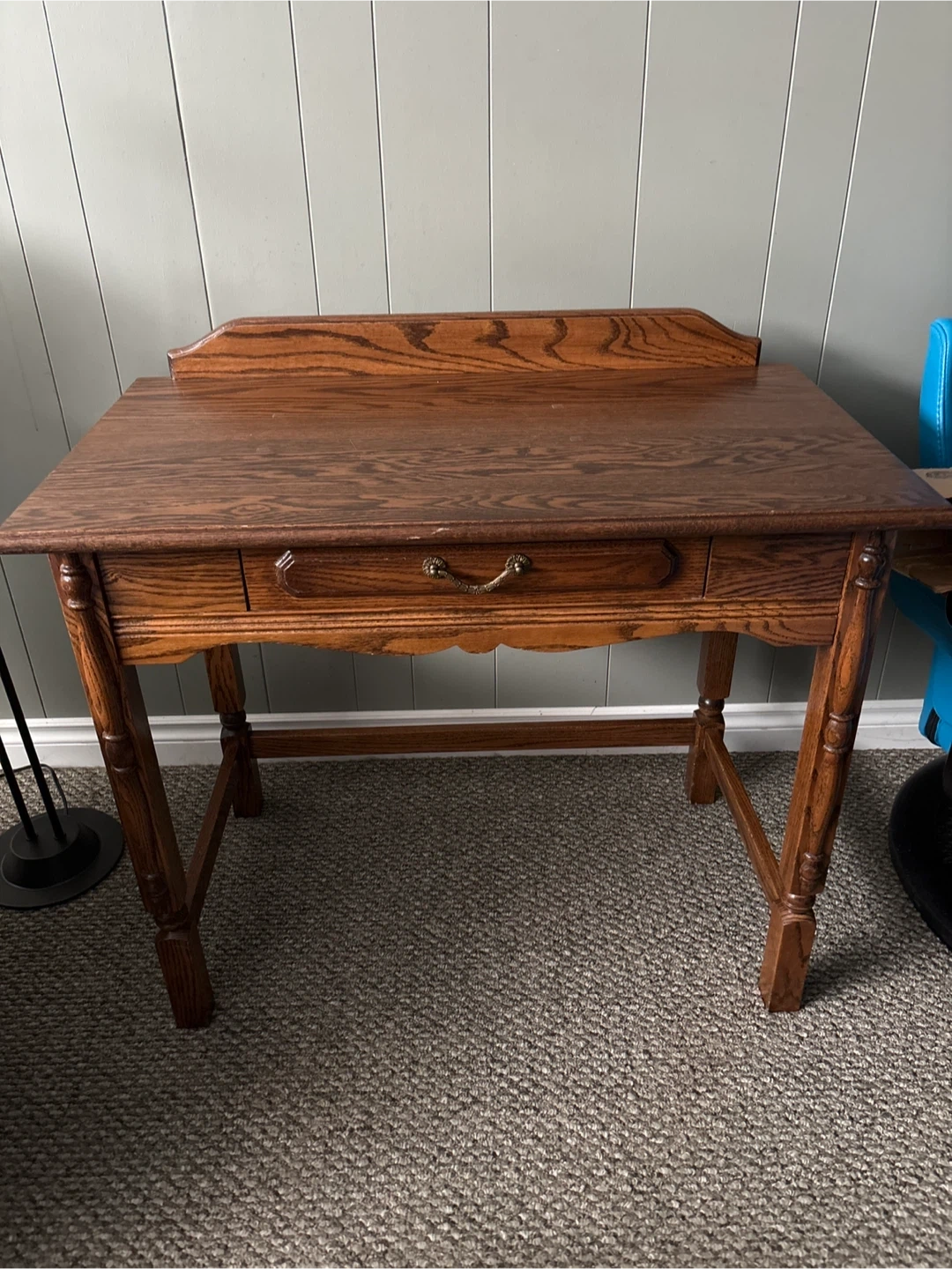 This is a vintage wooden writing desk with a single drawer. It's made of oak wood and features decorative carvings on the legs and drawer pull. The desk has a scalloped apron and a small hutch detail on the back. It's a great size for a small office or bedroom. This desk would be useful for someone needing a dedicated space for writing or computer work.