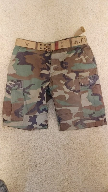 Bundle includes a camouflage jacket, matching pants, and a tactical vest. Also comes with a pair of military-style boots and a canteen with a cover. Great for outdoor activities or collecting!