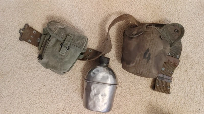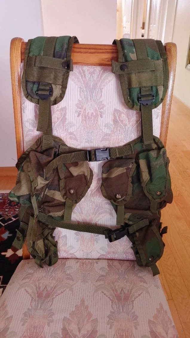 Military Camo Jacket, Pants, Vest, Boots, and Canteen