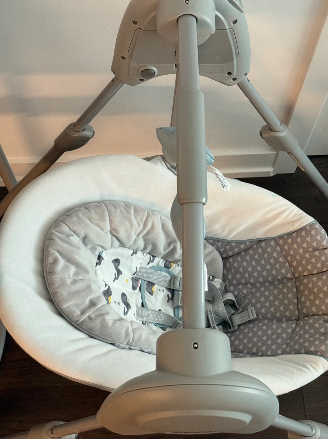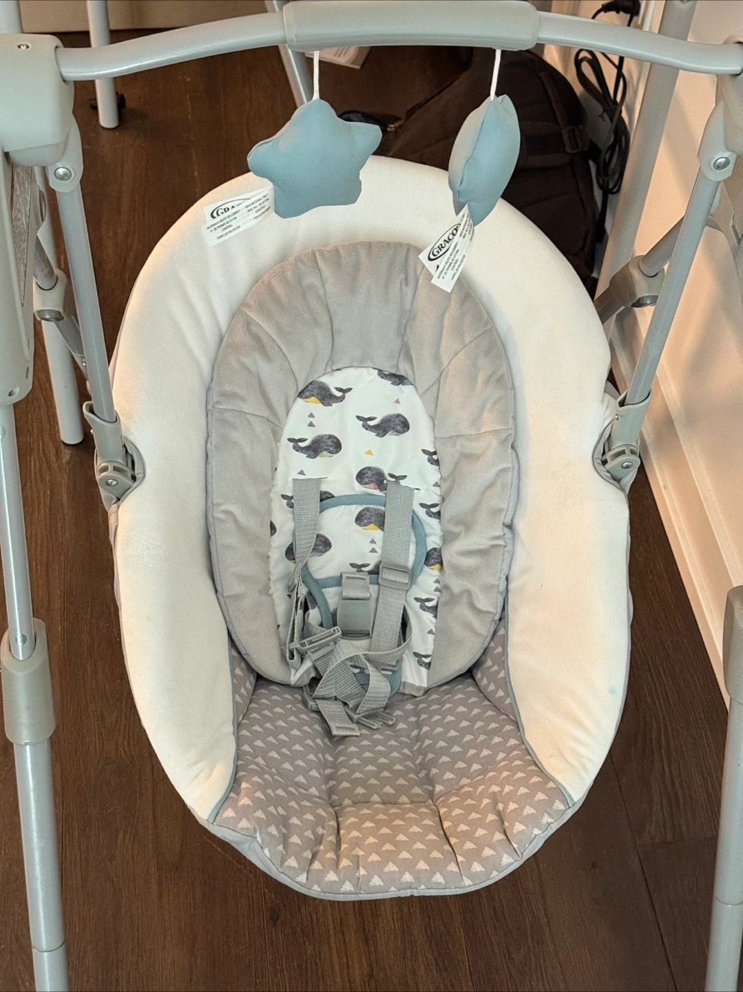Selling a gently used Graco baby swing. It's in great condition and features a comfy seat with a cute whale pattern! The swing also comes with hanging toys and three speed variations to keep your little one entertained. Perfect for soothing and entertaining your baby! (have the box as well.)