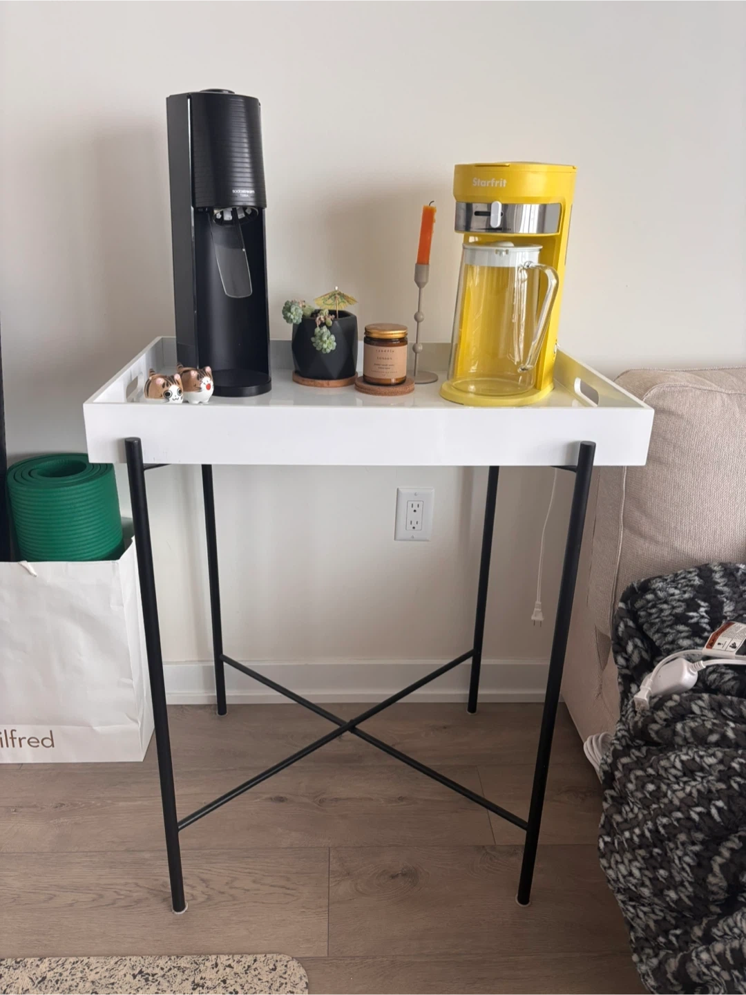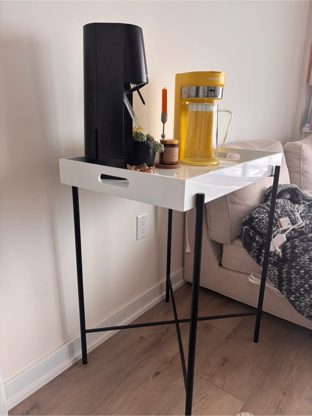 This tray table from West Elm has a white top and black metal legs. It's great for holding coffee makers or as a side table. You can take the tray of and also fold it.