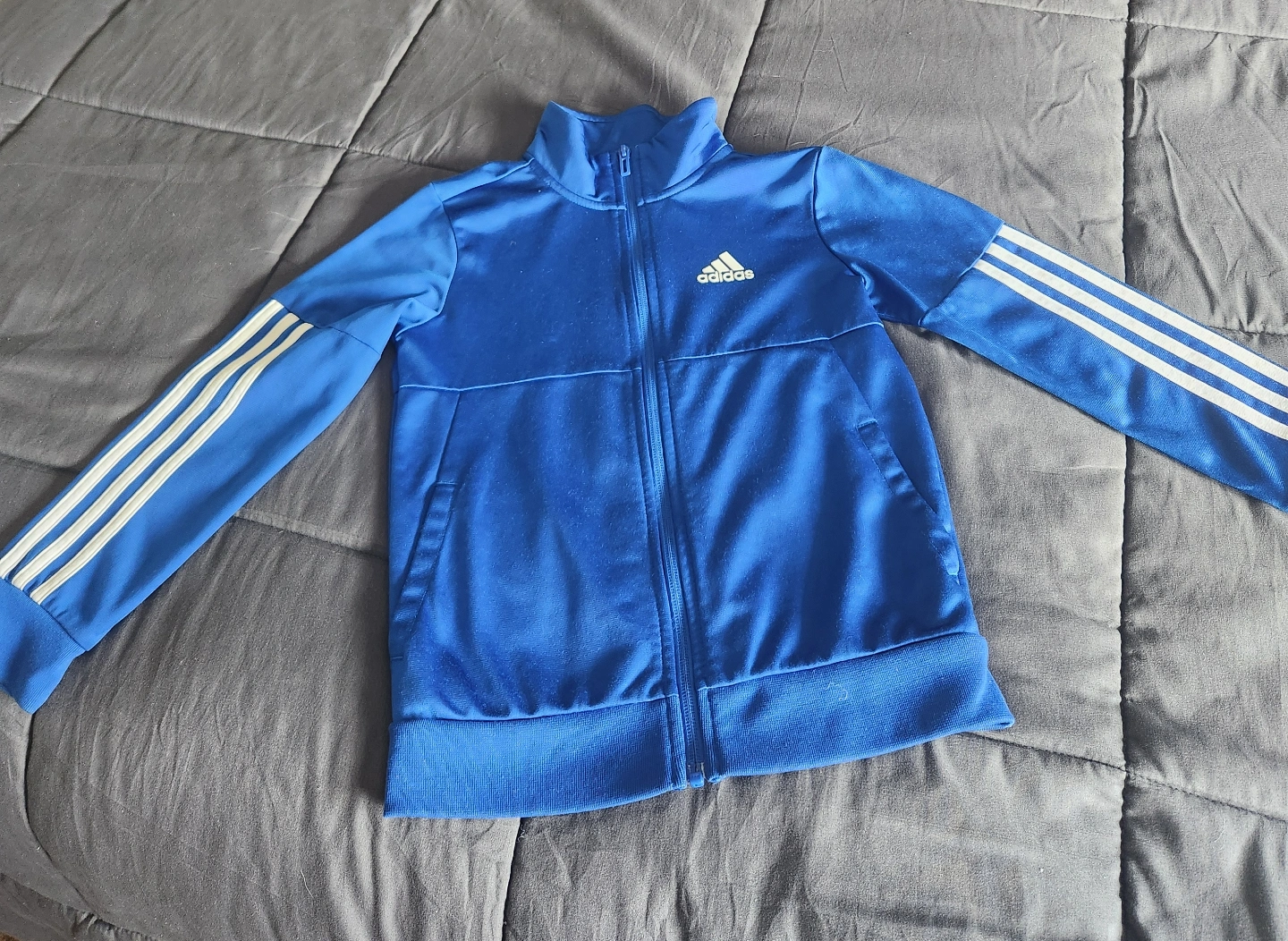 Blue Adidas track jacket. Features white stripes on sleeves. Full zip closure. Pockets on sides.