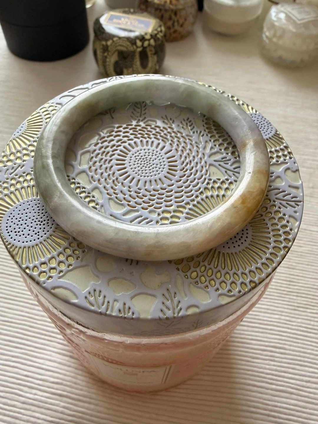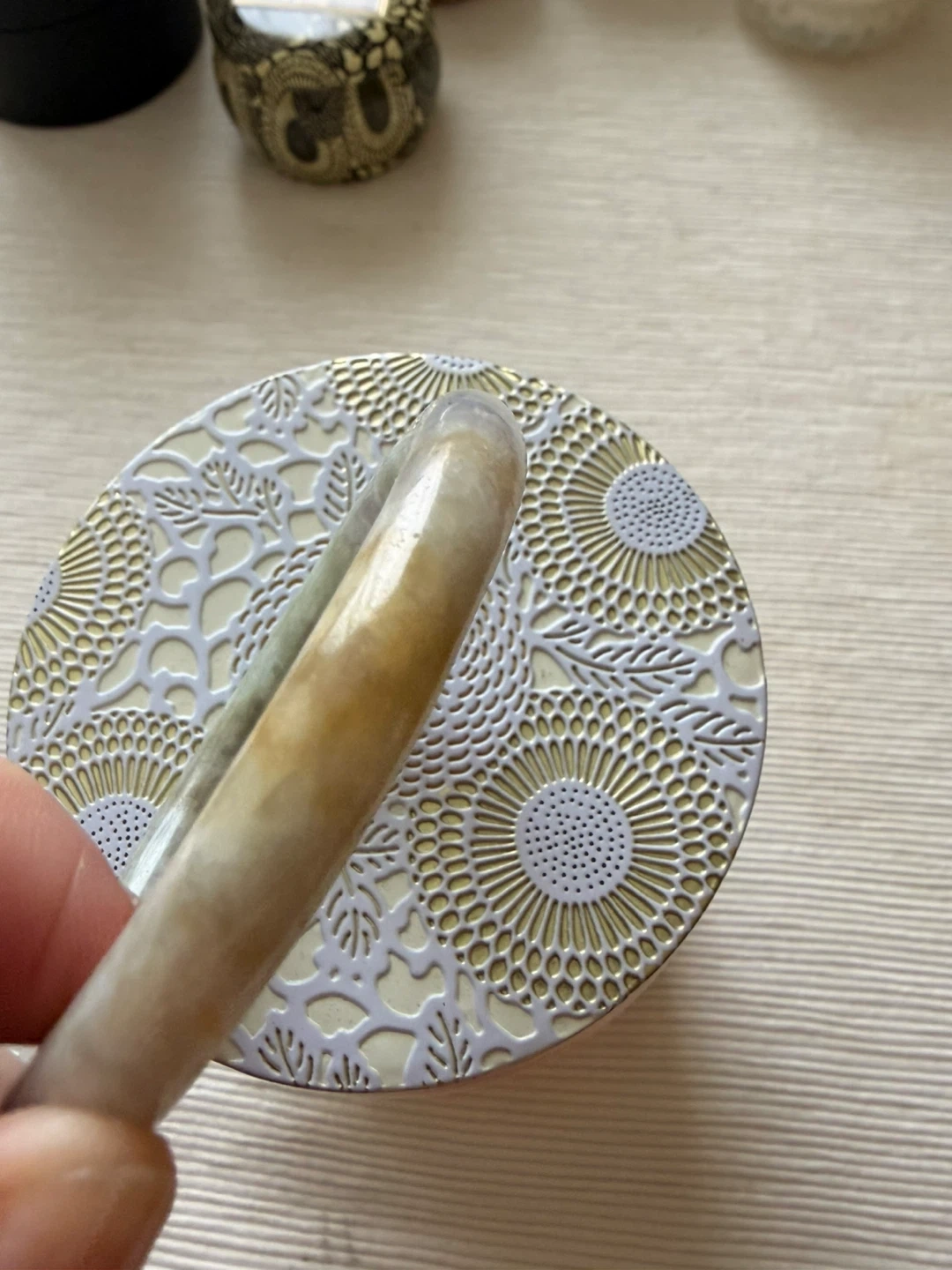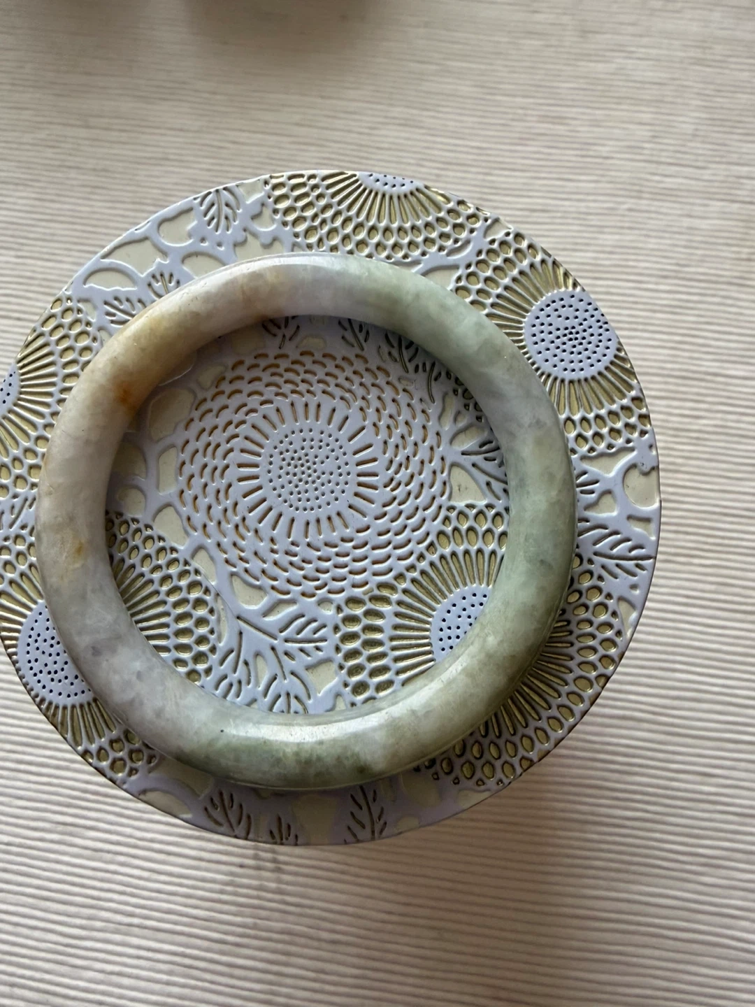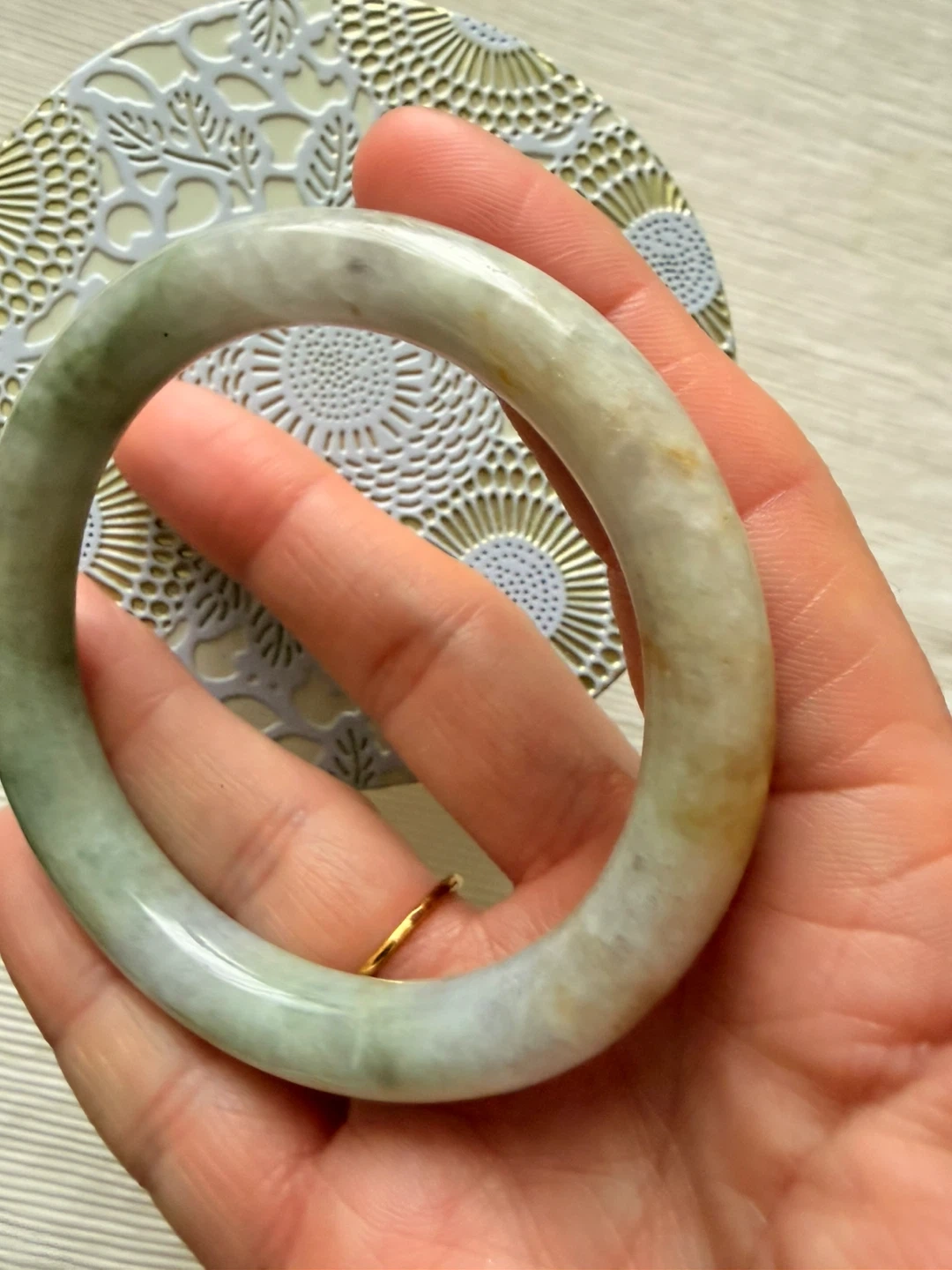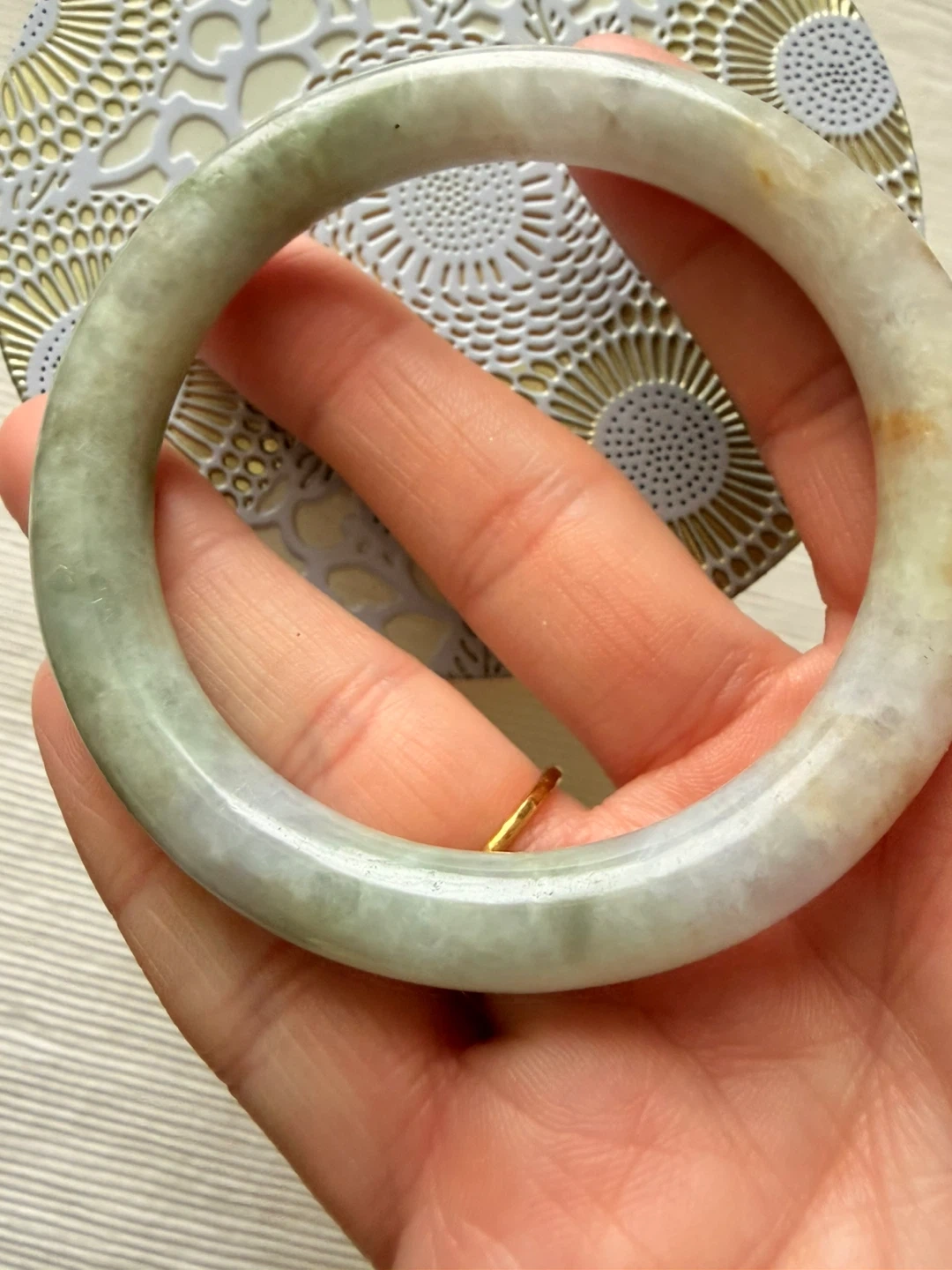 This is a beautiful jade bangle bracelet with a marbled green and beige colouration. It measures approximately 2.5 inches in diameter. A classic accessory that complements any outfit!