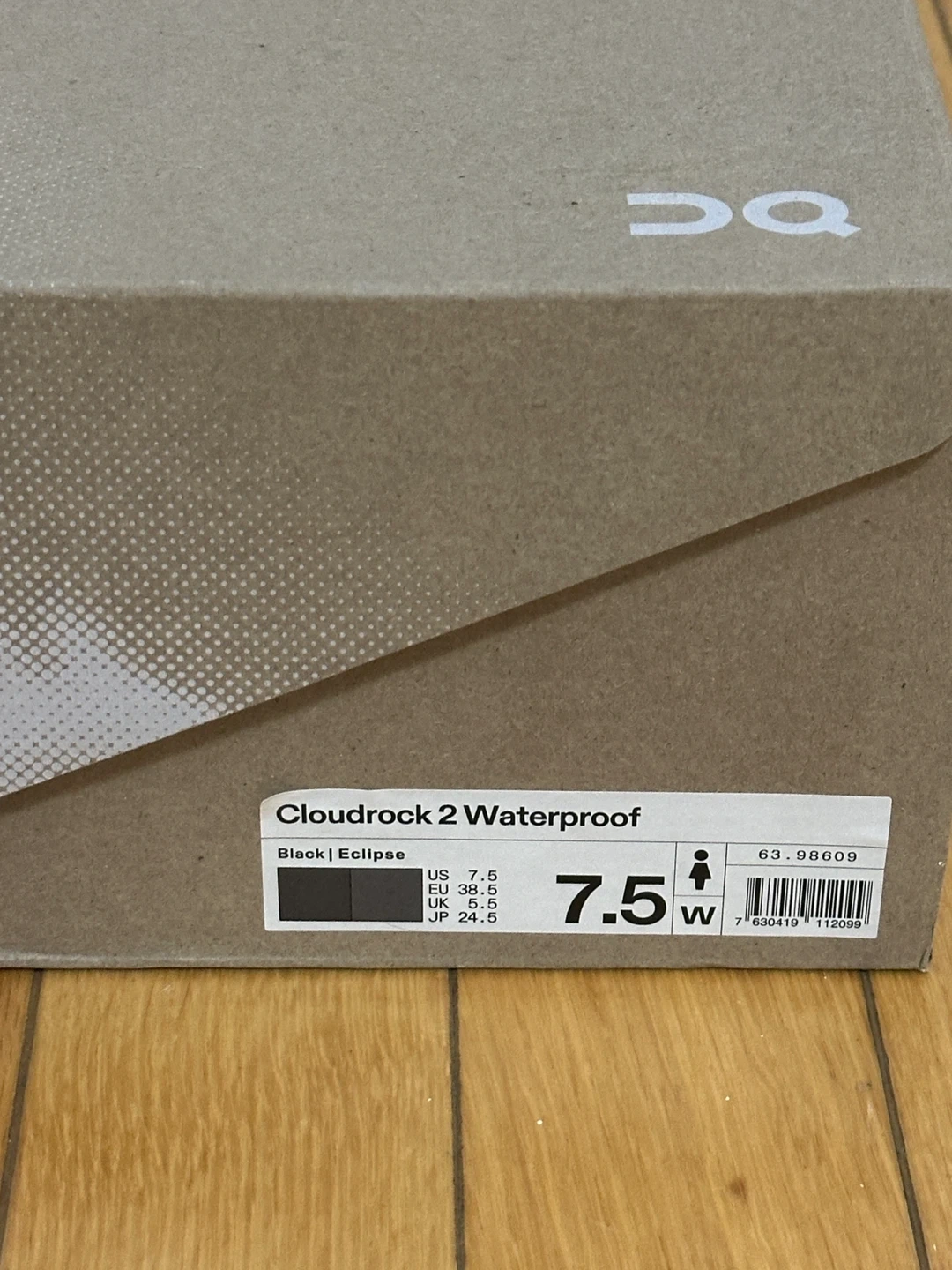 These On Cloudrock 2 Waterproof hiking boots are black with an eclipse colourway. They're designed for waterproof performance and rugged terrain. The women's size is 7.5 US. These boots are built for your next outdoor adventure!