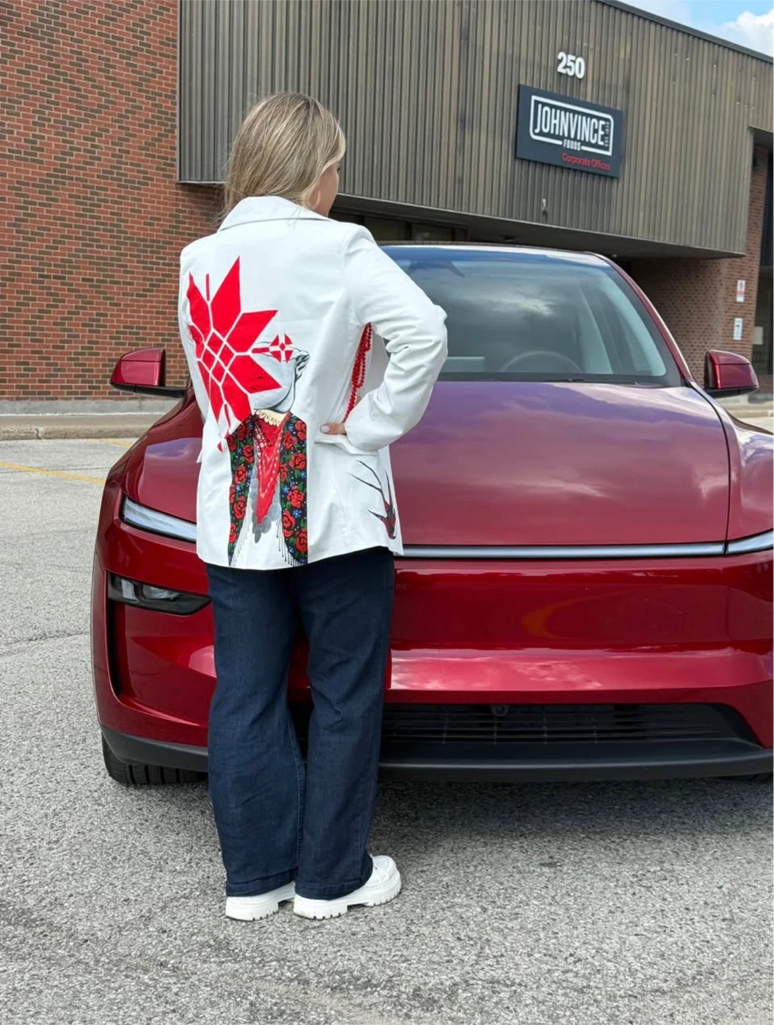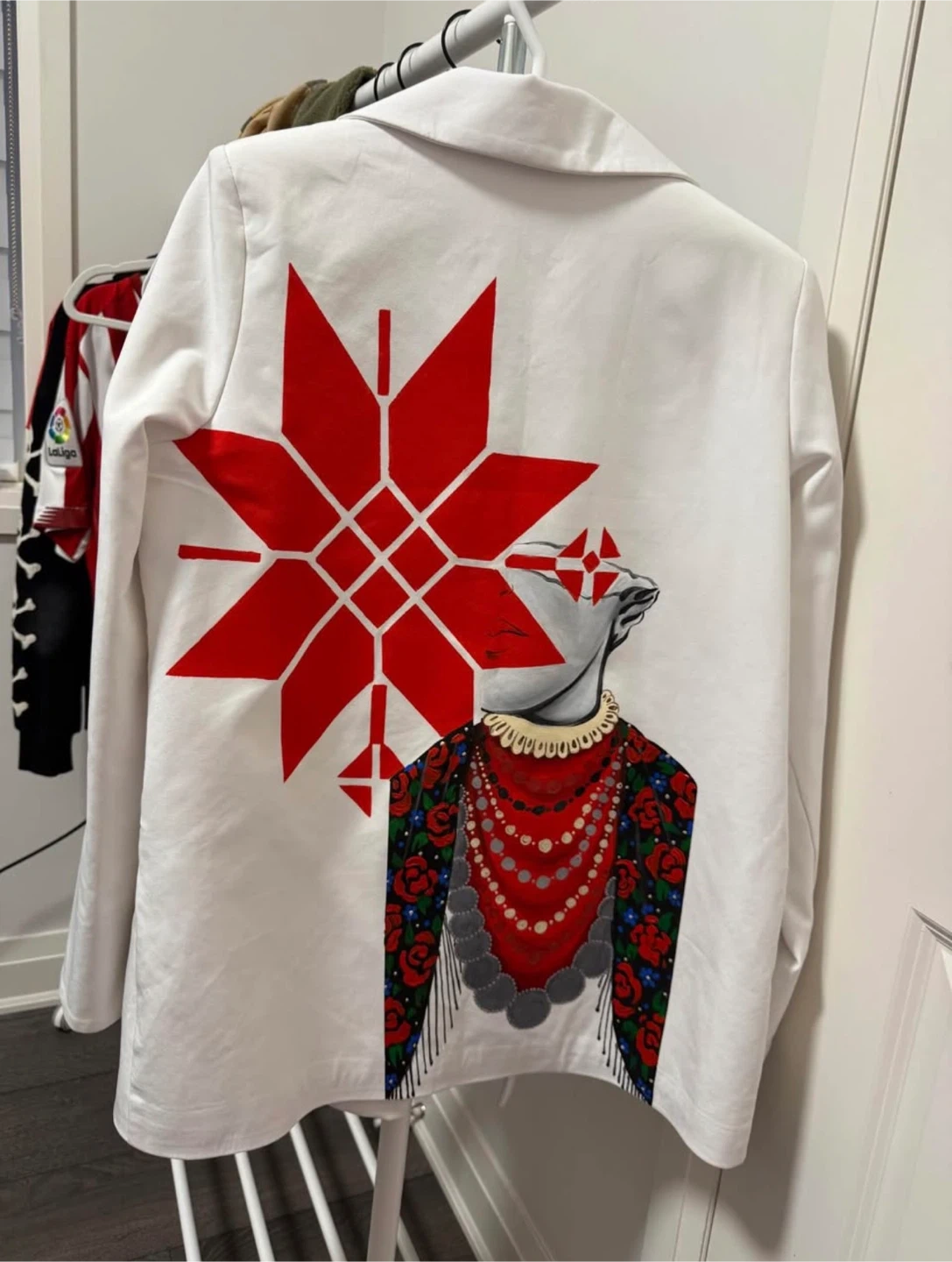 The design is inspired by Ukrainian ethnic motifs blended with modern artistic vision. Bold red symbol, expressive portrait, intricate details — a true statement piece with meaning and character.