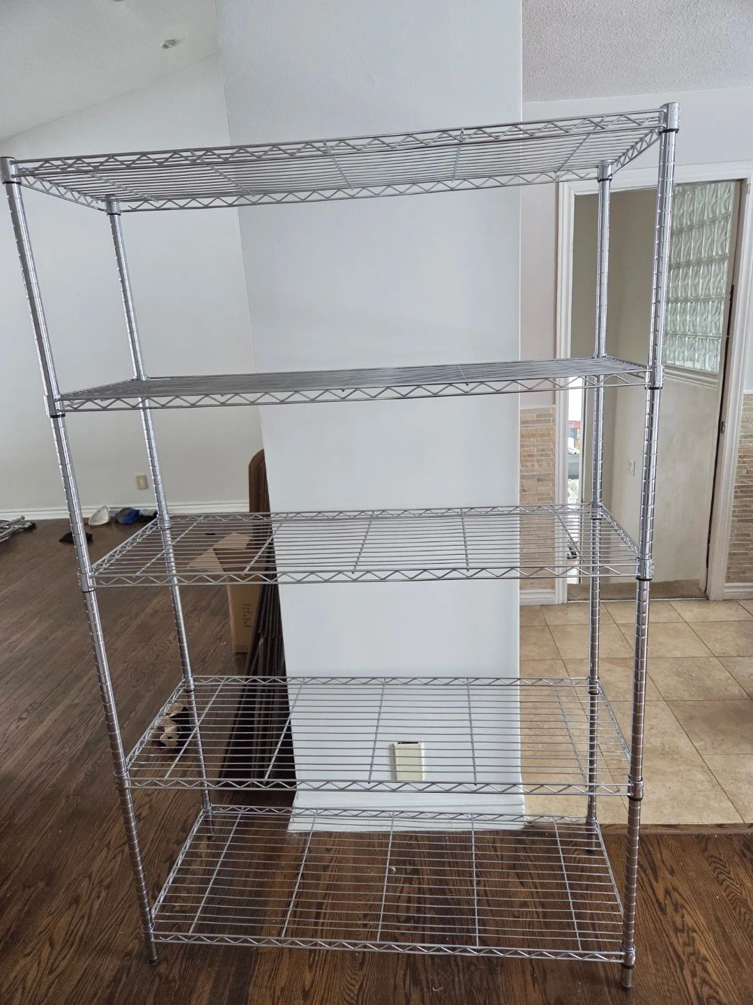 This is a 5-tier wire shelving unit. It's made of metal with a chrome finish. The shelves are adjustable to suit your needs. This unit's great for organizing garages, kitchens, or storage areas!
