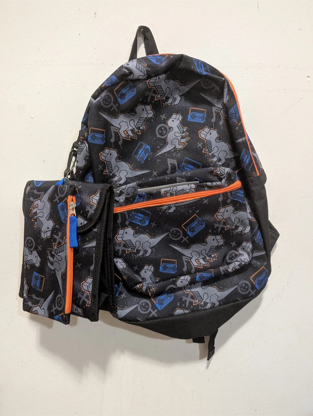 This backpack is perfect for any dinosaur or music lover! It features a fun print with dinosaurs and boomboxes. It has a side pocket for extra storage
