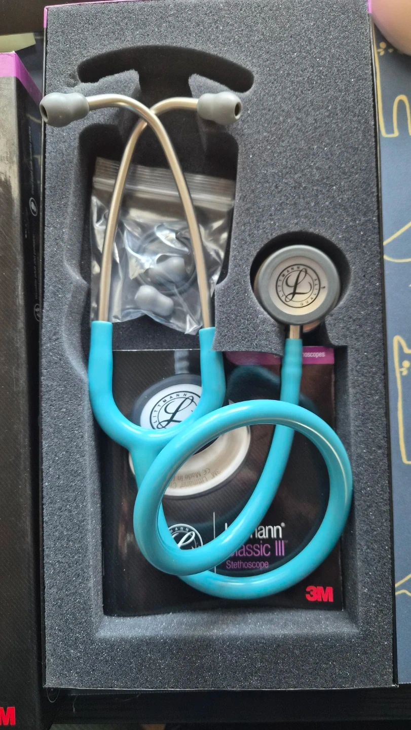 This is a teal Littmann Classic II stethoscope. It includes extra eartips in a small bag. This stethoscope is ideal for healthcare professionals needing a reliable diagnostic tool.