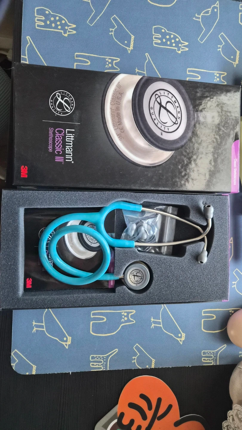 This is a teal Littmann Classic II stethoscope. It includes extra eartips in a small bag. This stethoscope is ideal for healthcare professionals needing a reliable diagnostic tool.