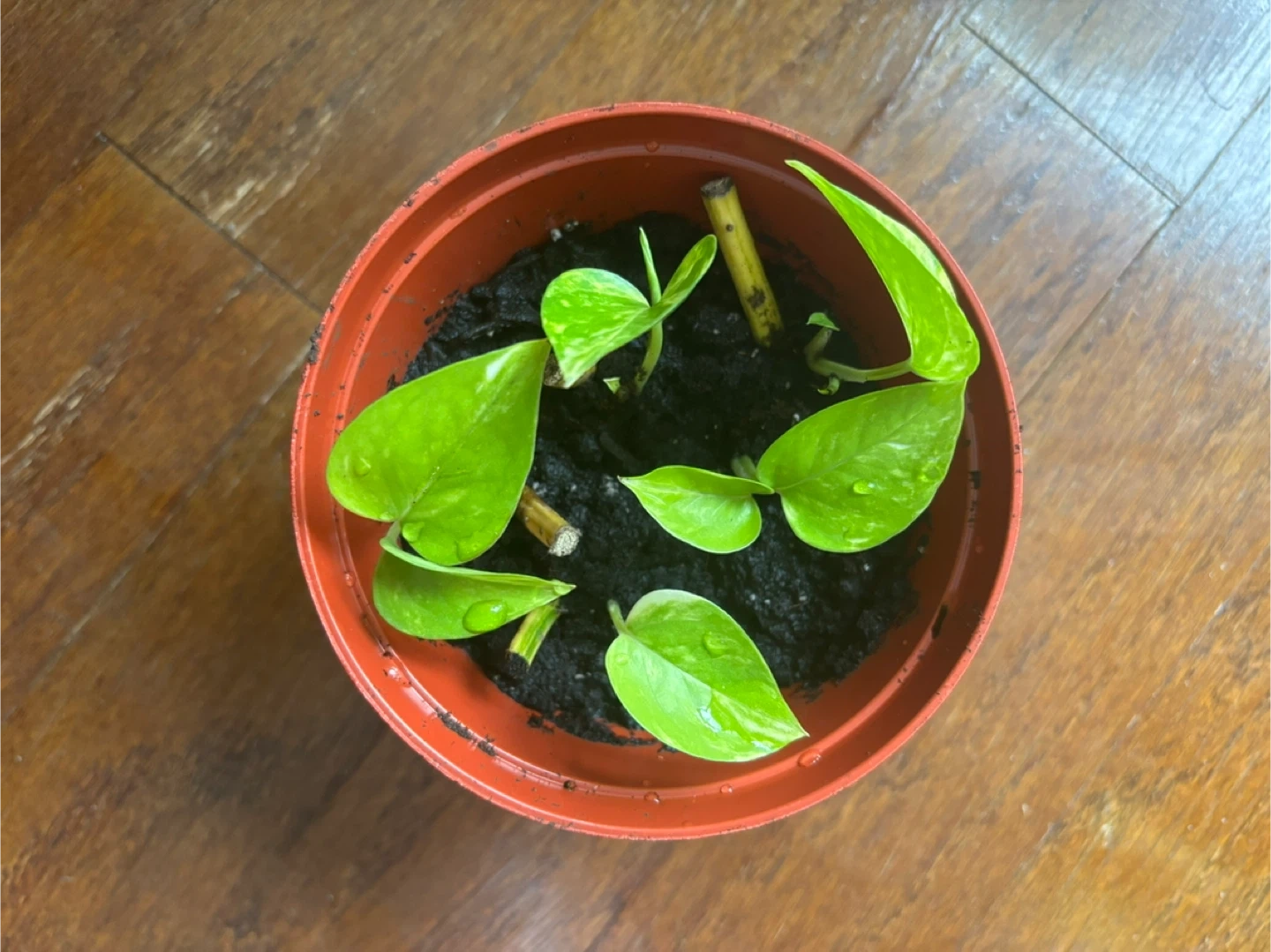 Several healthy pothos plant cuttings ready for propagation. They're in a standard plastic pot with soil. Perfect for starting a new plant or expanding your collection!