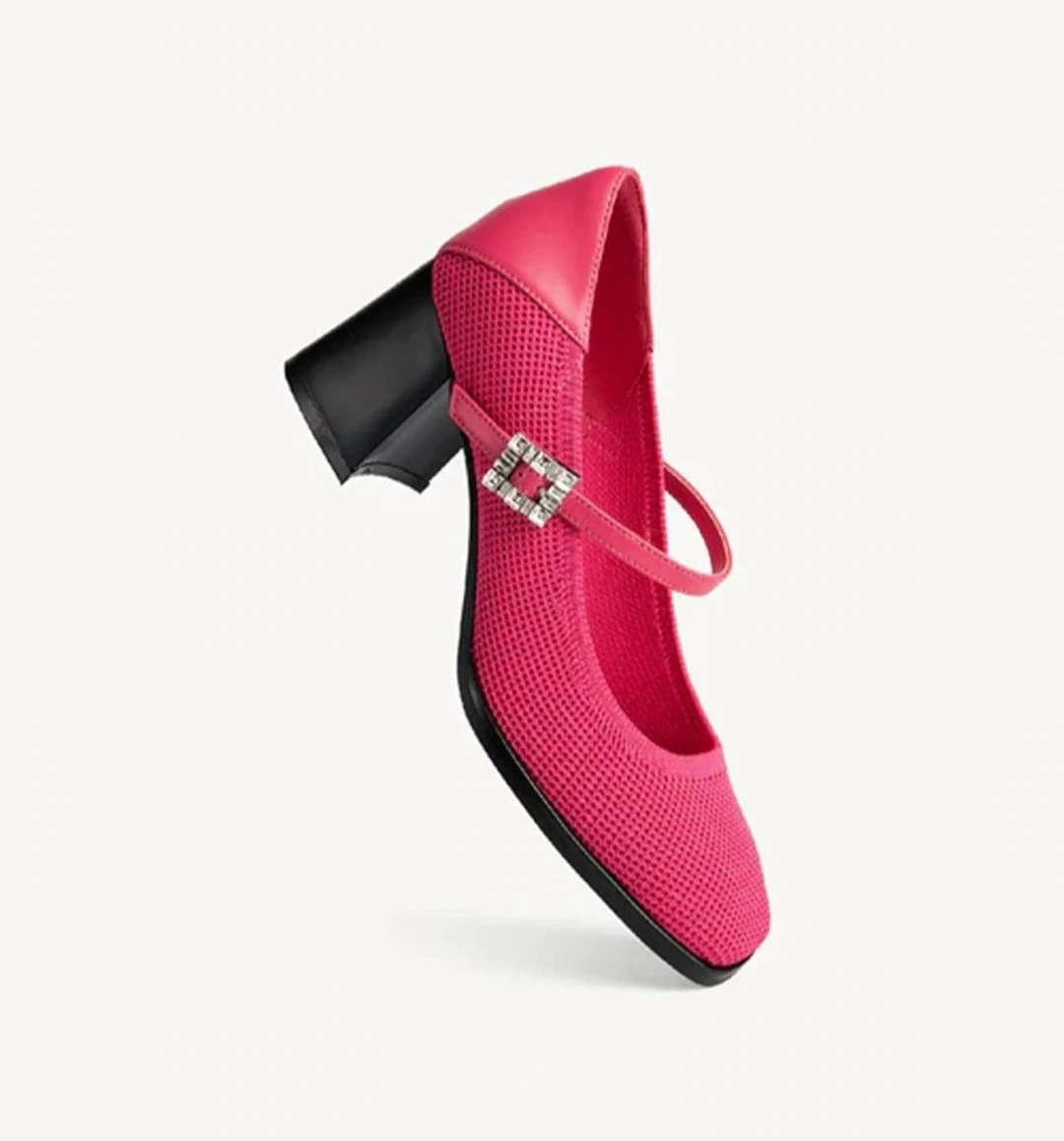 These stylish pink Mary Jane heels feature a comfortable knit upper and a chic square toe. They have an adjustable strap with a dazzling rhinestone buckle. The block heel adds a touch of elegance, perfect for dressing up or down!