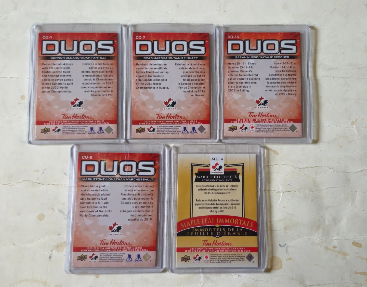 This is a lot of 5 Tim Hortons hockey trading cards. It includes cards featuring Connor Bedard, Sam Reinhart, Sarah Nurse, Mark Stone, and Marie-Philip Poulin. These cards are from the 2025-2026 Tim Hortons Collection Series.