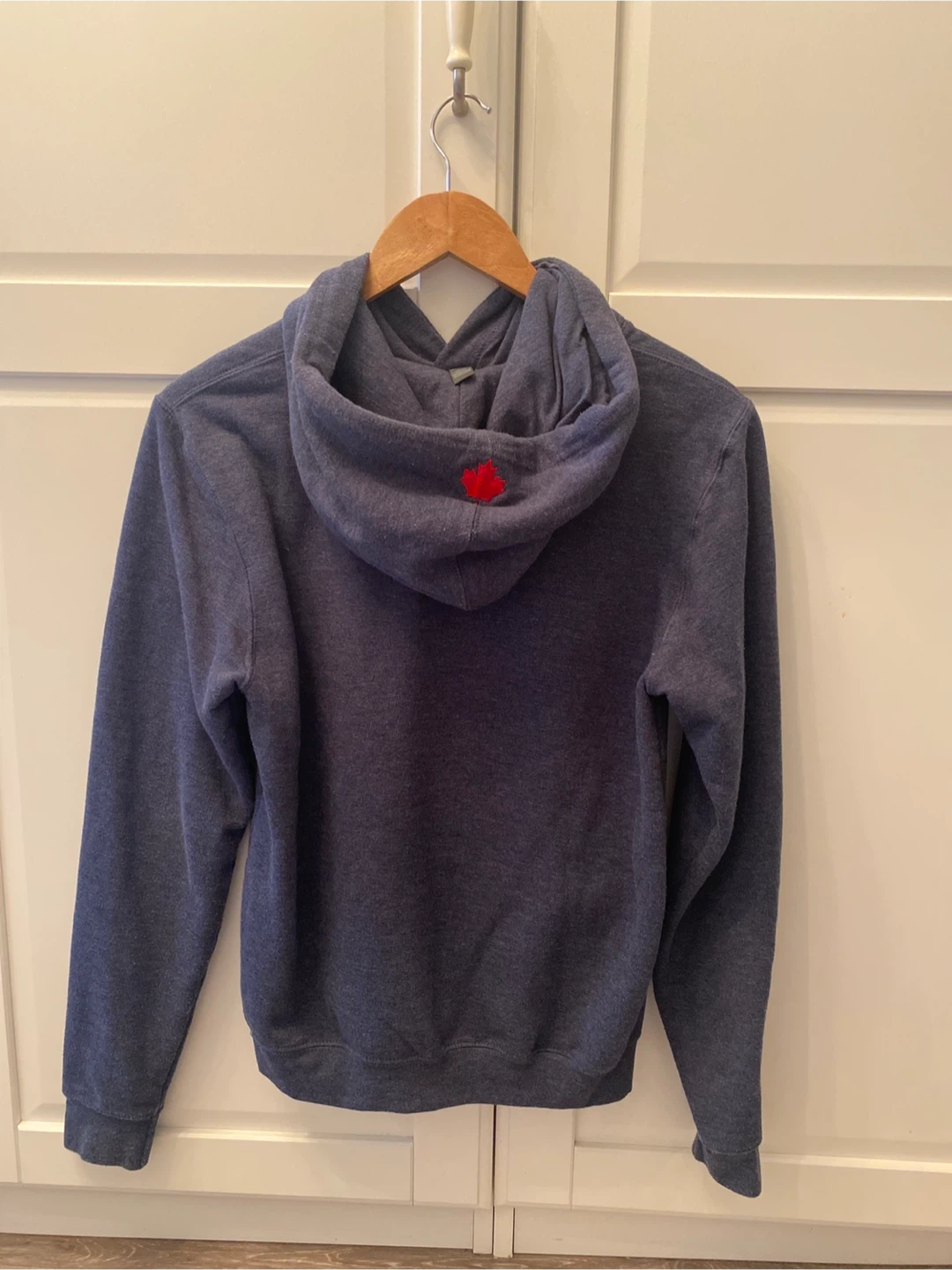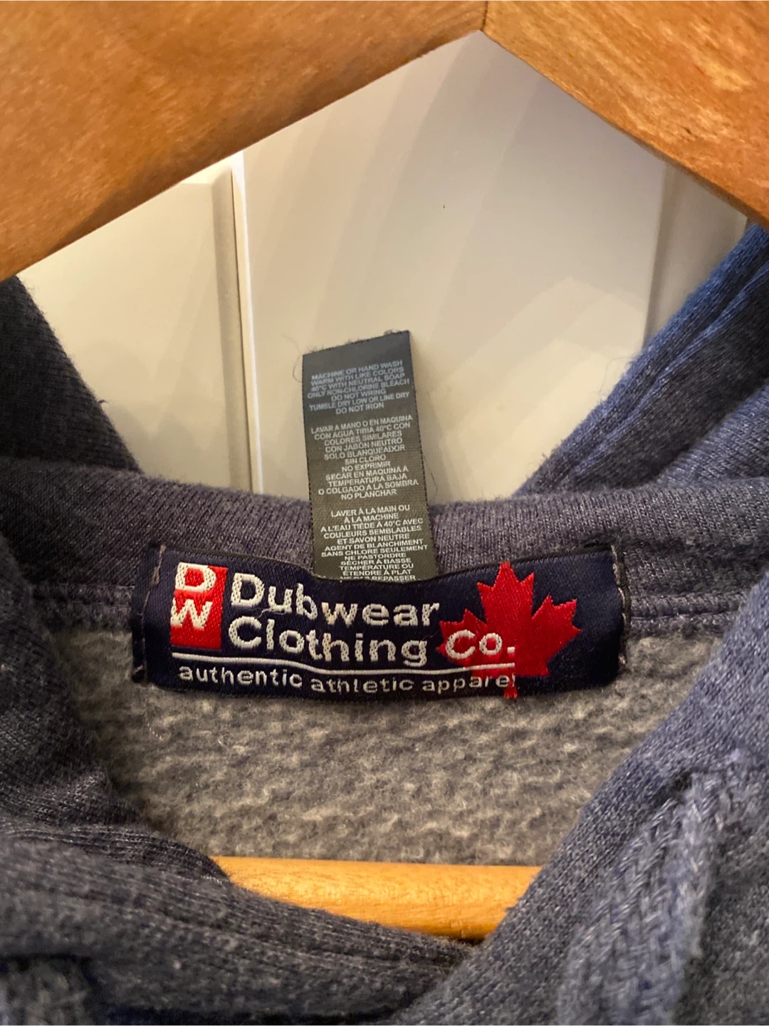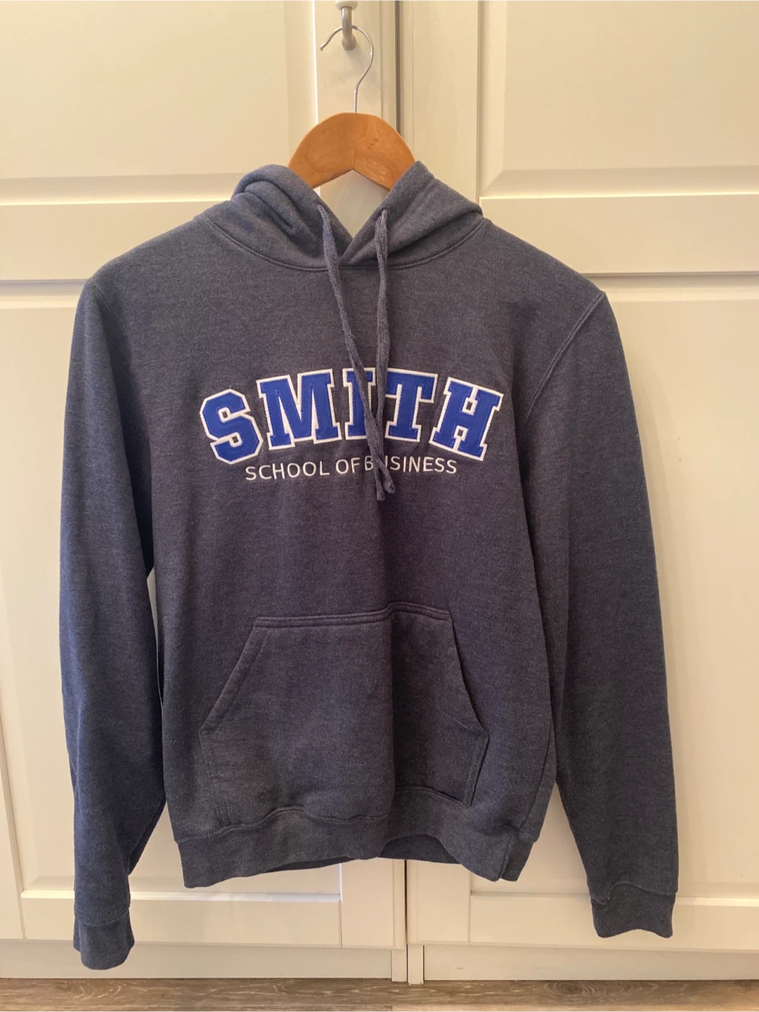 Navy blue hoodie from Dubwear Clothing Co. that says Smith School of Business. It's made of 50% cotton and 50% polyester. Made in Mexico.