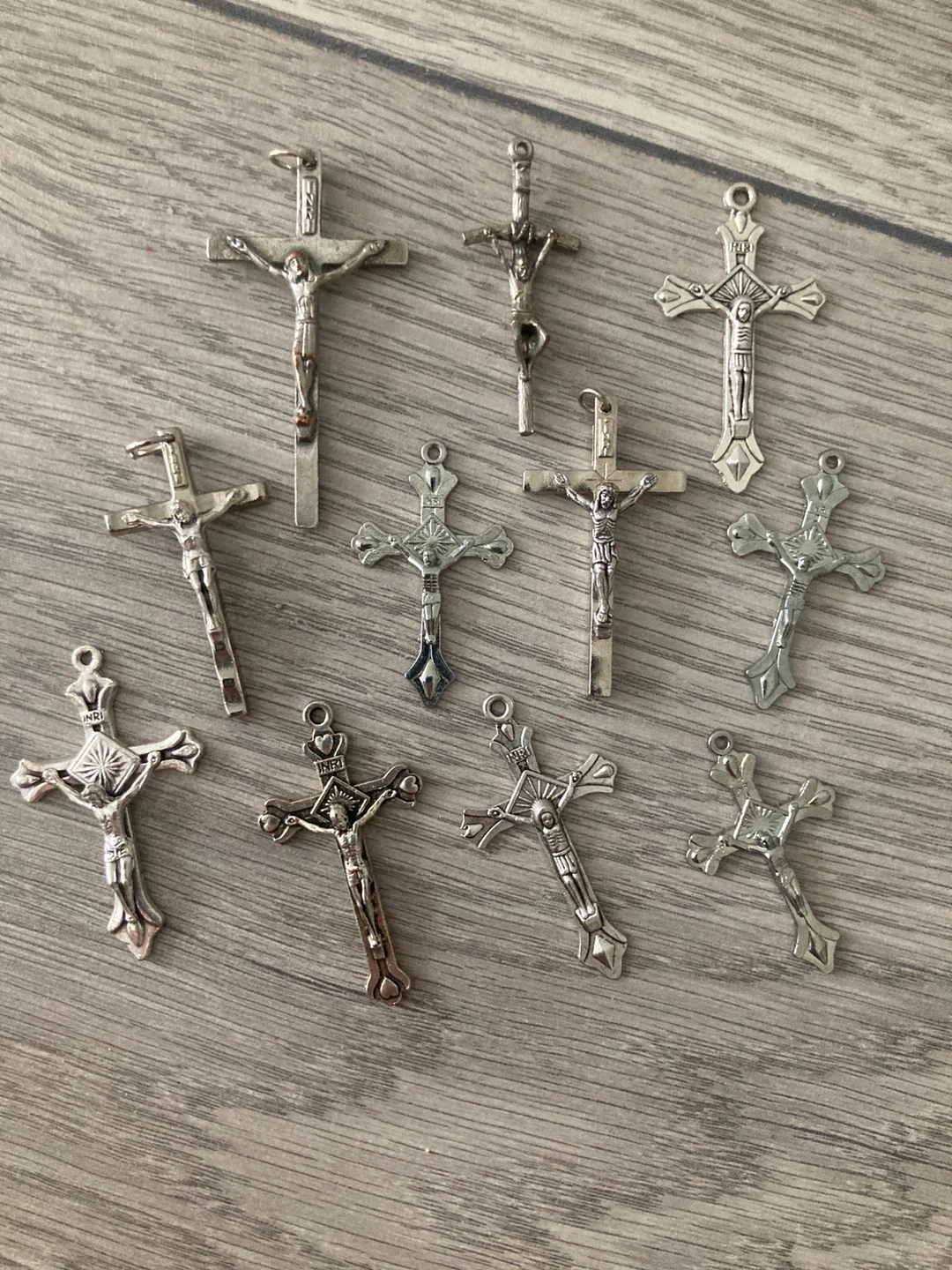 This lot includes nine crucifix pendants. They are silver-toned metal with varying intricate designs. Each pendant has a loop for attaching to a chain or cord.