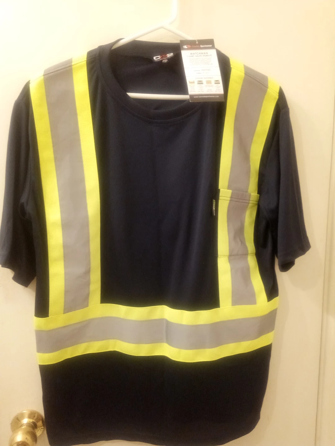 This navy blue Watchman work shirt features high-visibility yellow and grey reflective striping. It has a chest pocket and short sleeves. The fabric is designed for comfort and durability on the job.