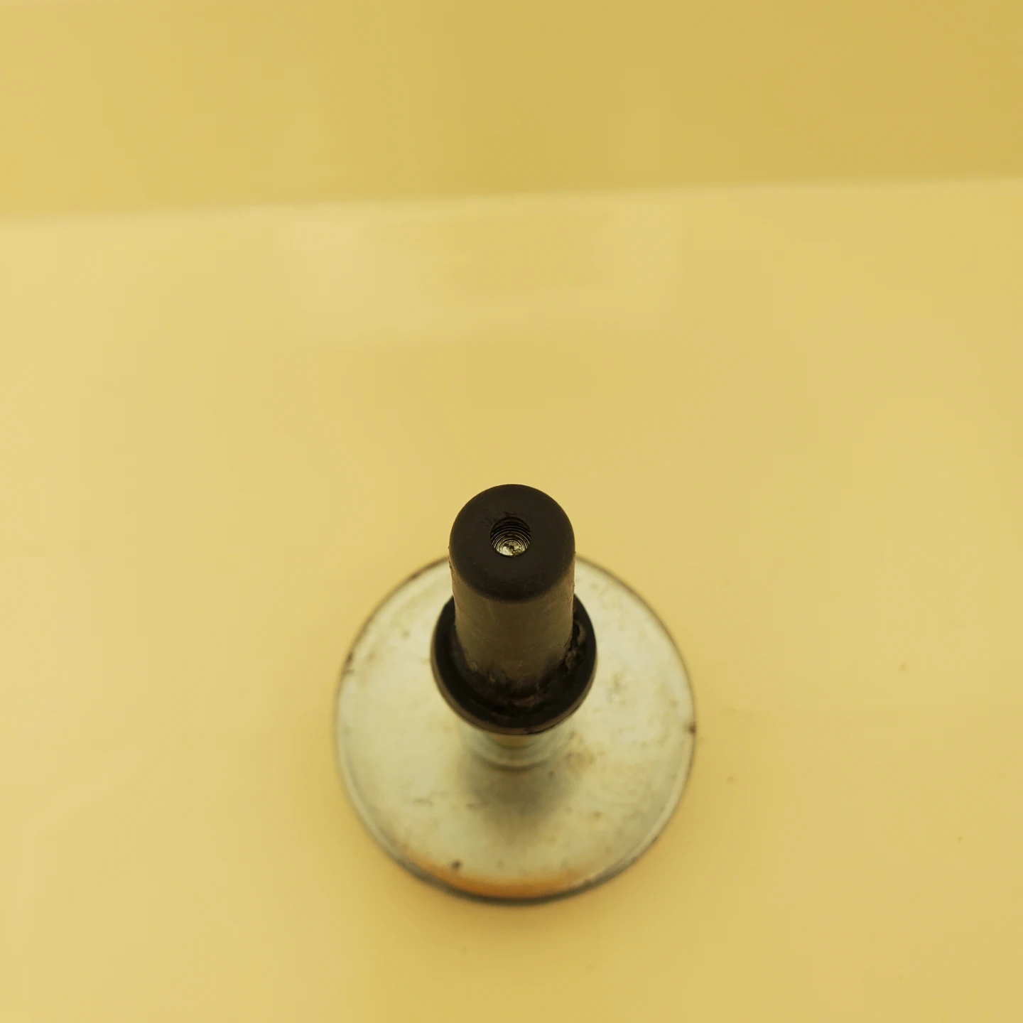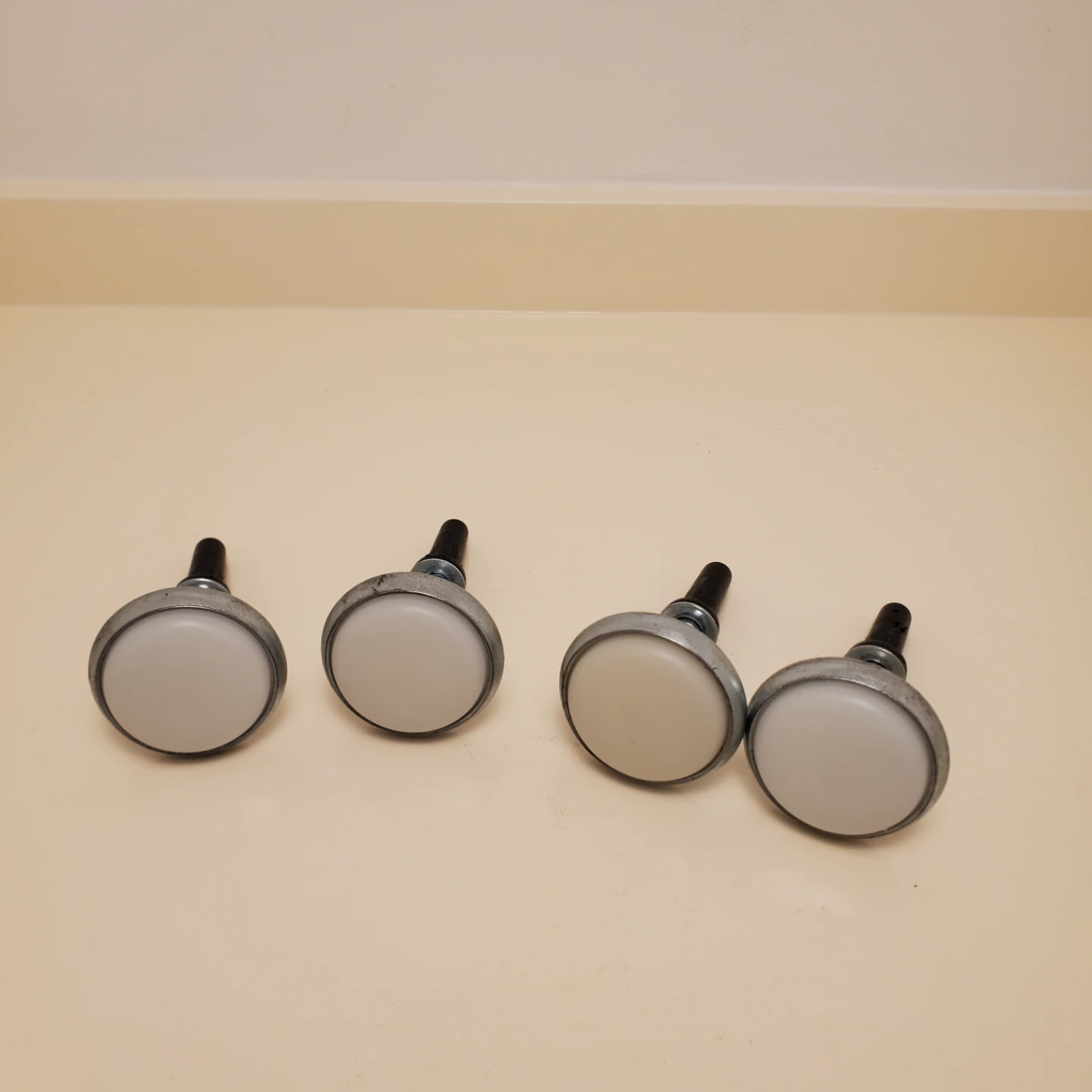 Four furniture glides with metal bases and black stems to replace wheels if wanted. The round, white tops are likely plastic. These are designed to help furniture move smoothly across floors. Stem is approximately 1.5 inches long, with a metal base diameter of about 1.5 inches. They have wear.